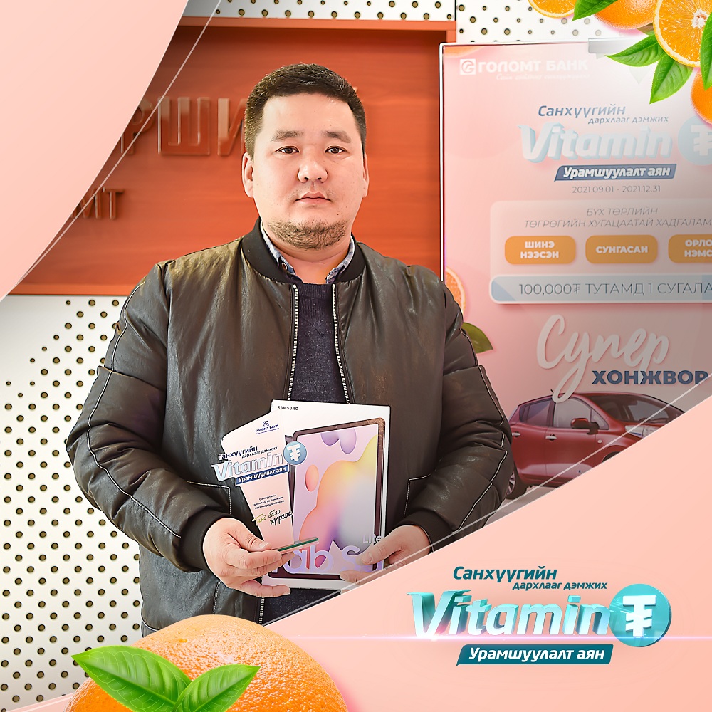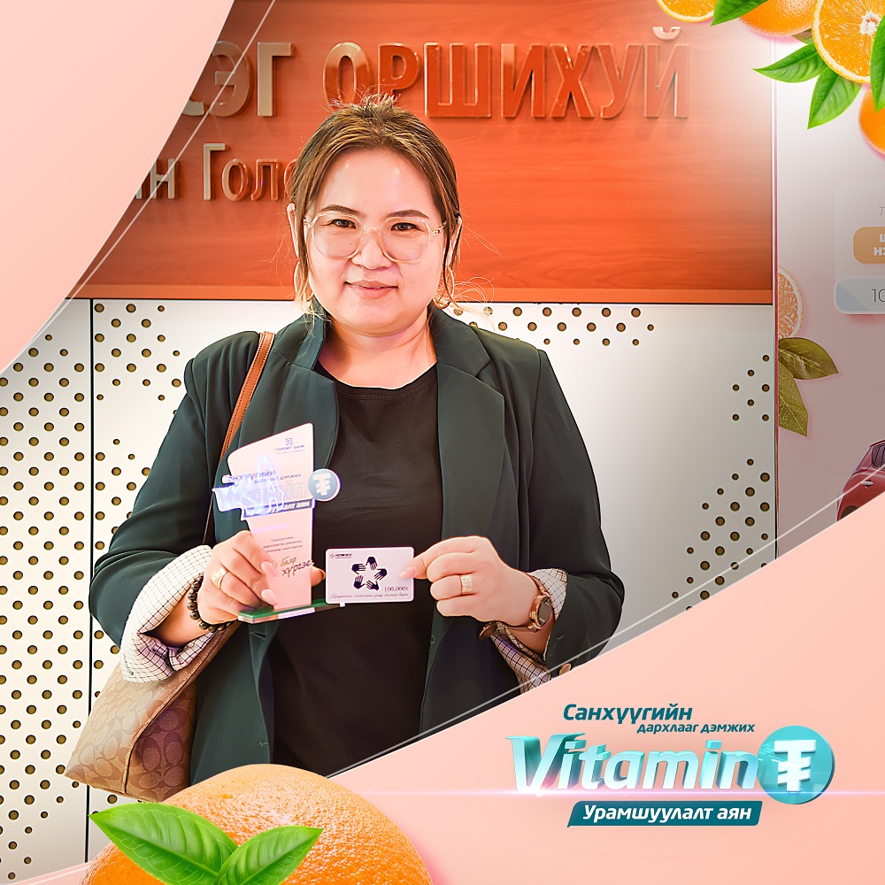 “Витамин ₮” аяны азтан болсондоо баяртай байна. Би Голомт банкны хадгаламждаа өдөр бүр, тогтмол дүнгээр орлого хийдэг. Тэр орлогоос маань сугалаа үүсэж, худалдан авалтын эрхийн бичиг хожсон байна.