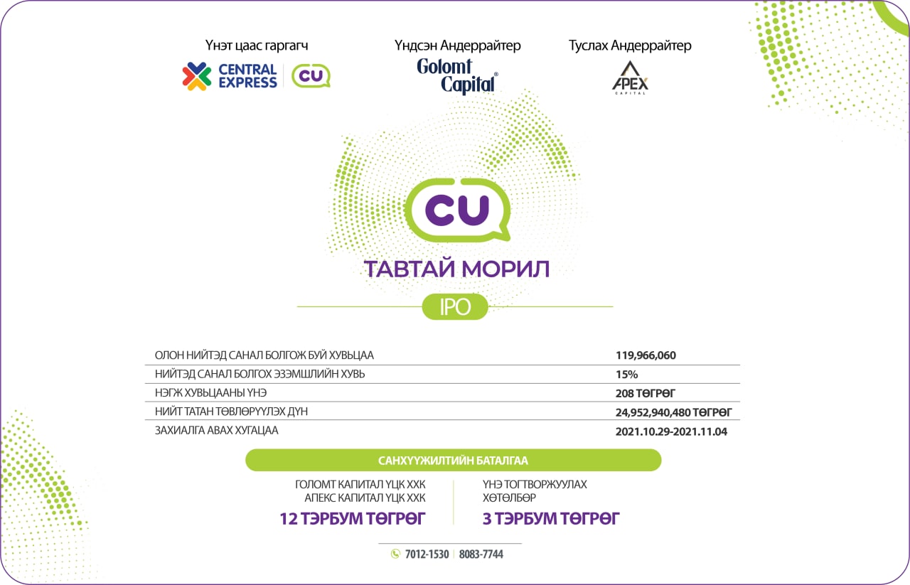 "CU" брэндийн франчайз эрхийг эзэмшигч "Сэнтрал Экспресс Си Ви Эс" ХХК 2021 оны хамгийн анхны төдийгүй Монгол Улсын бүх цаг үеийн хамгийн өндөр дүнтэй IPO-г олон нийтэд санал болгож байна.