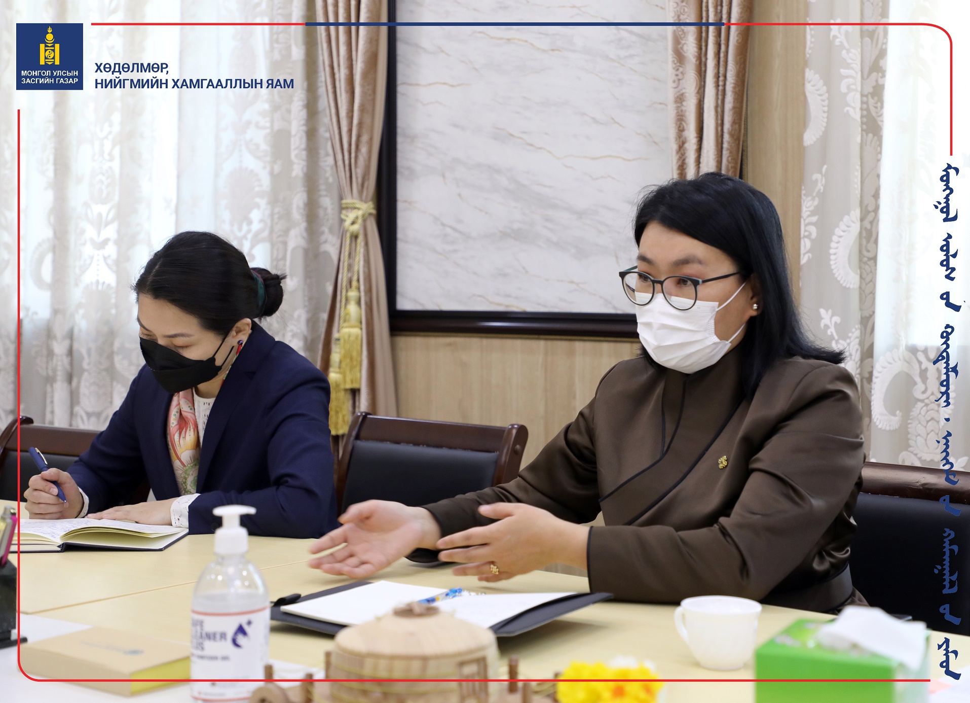 Уулзалтын үеэр хөдөлмөр, нийгмийн хамгааллын салбар дахь хоёр талт хамтын ажиллагаа болон цаашид хөгжүүлэх үйл ажиллагааны чиглэлээр санал солилцов.
