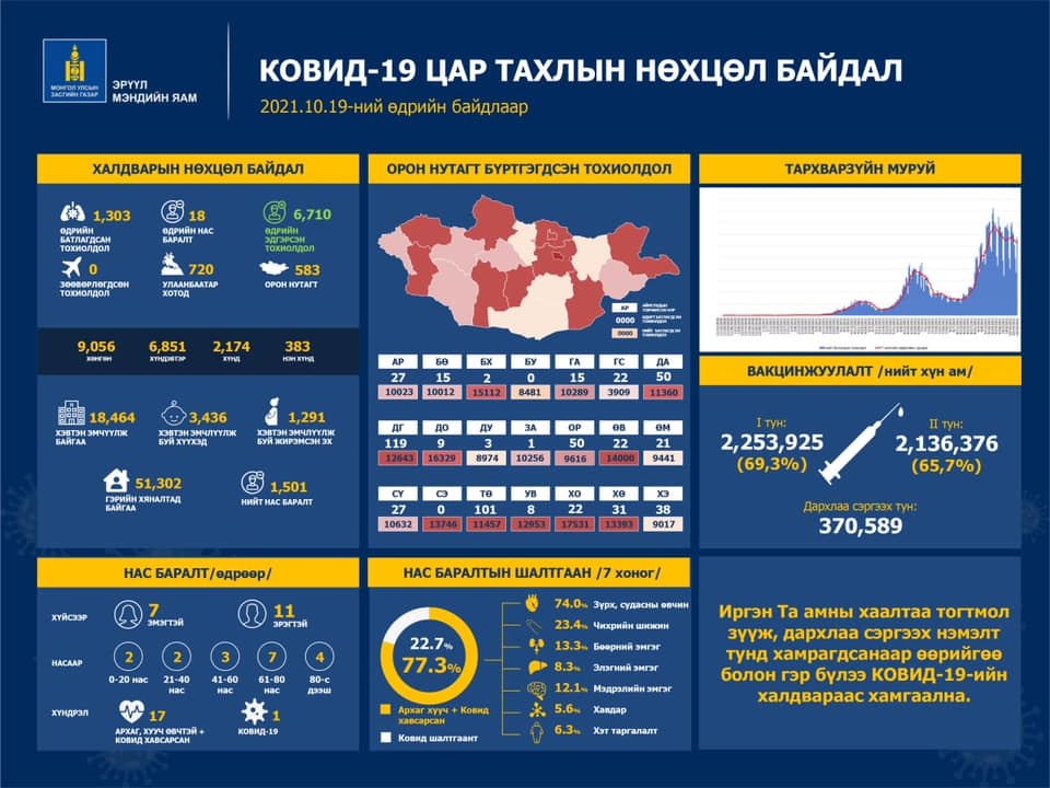Мөн хугацаанд нас баралт дөрвөөр нэмэгдэж, архаг хууч өвчтэй, ковид хавсарсан 18 (7 эмэгтэй, 11 эрэгтэй) хүн нас барсан байна. Талийгаачдын ар гэрт гүн эмгэнэл илэрхийлье.