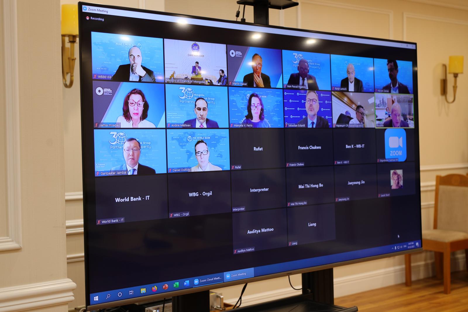 Сангийн сайд Б.Жавхлан өчигдөр /2021.10.22/ Дэлхийн Банкны Зүүн Ази, Номхон далайн бүс нутгийн орнууд хариуцсан Дэд ерөнхийлөгч хатагтай Мануело Феротой цахимаар уулзалт хийжээ. Хатагтай Феро Монгол Улсын Засгийн газраас авч хэрэгжүүлж байгаа цар тахлын эсрэг эрүүл мэндийн салбараа хамгаалах, эдийн засгаа сэргээх арга хэмжээнүүдийг шуурхай, вакцинжуулалтын түвшин өндөр байгааг онцлон тэмдэглэж, цаашид КОВИД-19 цар тахлын хүндрэлийг даван туулахад Дэлхийн банкны зүгээс бүхий л дэмжлэг үзүүлэн хамтран ажиллахаа илэрхийлжээ.
