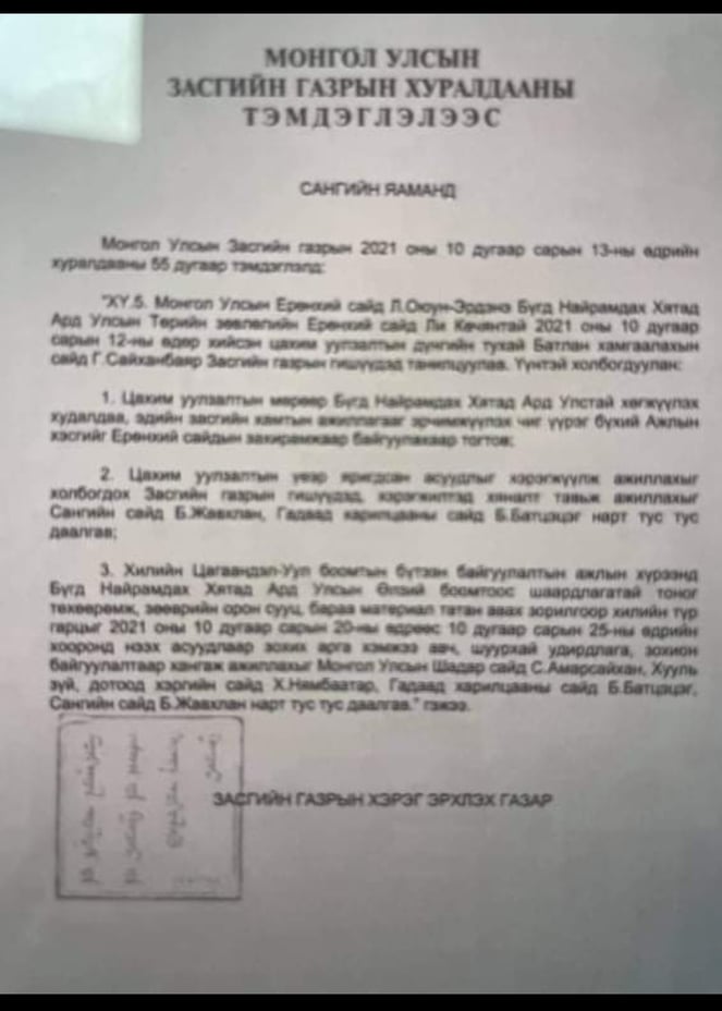 Тэд төрийн өндөр албан тушаалтнуудаар албан тоот үйлдүүлж, аймаг орон нутаг, Засгийн газрын түвшинд цаас шидэлцэх болжээ. Тухайлбал, Өмнөговь аймгийн Засаг дарга Р.Сэддоржид  Монгол Улсын Шадар сайд С.Амарсайханы гарын үсэгтэй “Хүсэлт уламжлах тухай” албан тоот саяхан ирүүлжээ. Харин Шадар сайдад “Дэмжлэг хүсэх тухай” албан тоотыг “Ундрах говь” ХХК-ийн гүйцэтгэх захирал Н.Батсуурь явуулсан байдаг. Улмаар Засгийн газрын хэрэг эрхлэх газраас Сангийн яаманд энэ сарын 13-ны өдрийн Засгийн газрын хуралдааны  тэмдэглэлийг хүргүүлсэн байдаг. Уг тэмдэглэлд “Цагаандэл-Өлзий” боомтын  бүтээн байгуулалтын ажлын хүрээнд БНХАУ-ын Өлзий боомтоос шаардлагатай тоног төхөөрөмж, зөөврийн орон сууц, бараа материал татан авах зорилгоор хилийн түр гарцыг 2021 оны 10 дугаар сарын 20-25-ны өдөр нээх асуудлаар зохих арга хэмжээ авч, шуурхай удирдлага зохион байгуулалтаар хангаж ажиллахыг Монгол Улсын шадар сайд С.Амарсайхан, Хуульзүй дотоод хэргийн сайд Х.Нямбаатар, Гадаад харилцааны сайд Б.Батцэцэг, Сангийн сайд Б.Жавхланд тус тус даалгав” гэжээ.