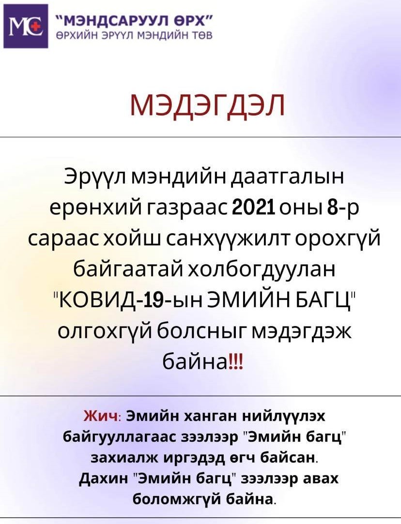 "Мэнд Саруул" өрхийн эмнэлгийн гаргасан МЭДЭГДЭЛ