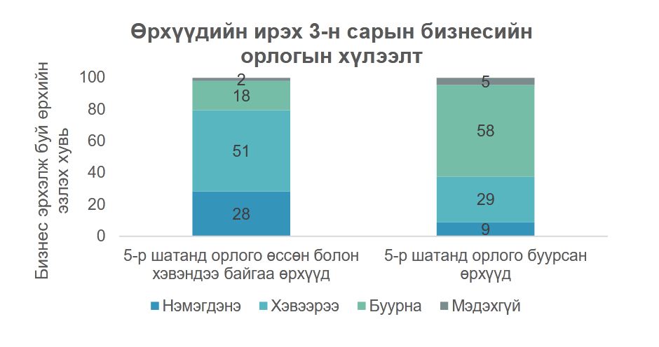 Шинэ судалгааны дүнгээр цар тахлын өмнөх үетэй харьцуулахад орлого нь өссөн болон хэвэндээ байгаа бизнес эрхлэгчид ирэх гурван сард борлуулалтын орлогоо нэмэгдэнэ гэсэн хүлээлттэй байна.
