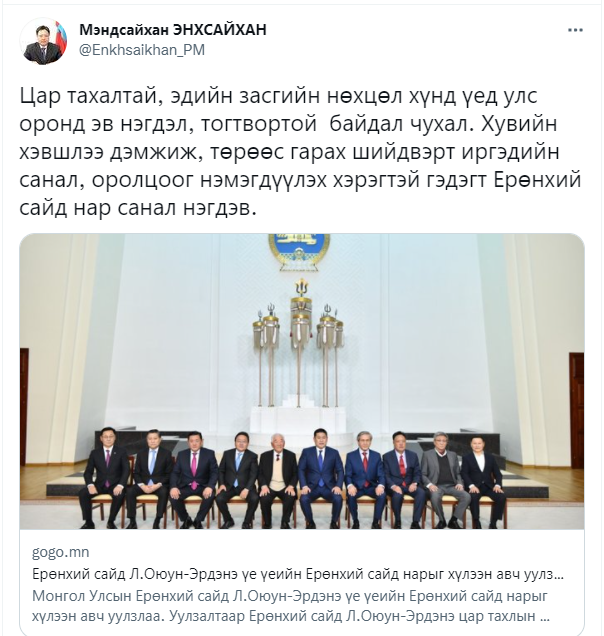 Тэгвэл уулзалтад оролцсон Ерөнхий сайд асан М.Энхсайхан өөрийн цахим хуудаснаа үзэл бодол, байр сууриа илэрхийлжээ.
