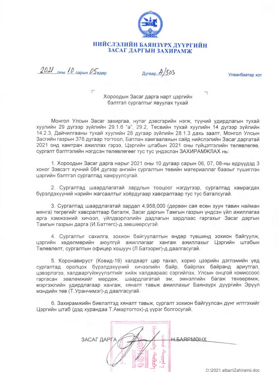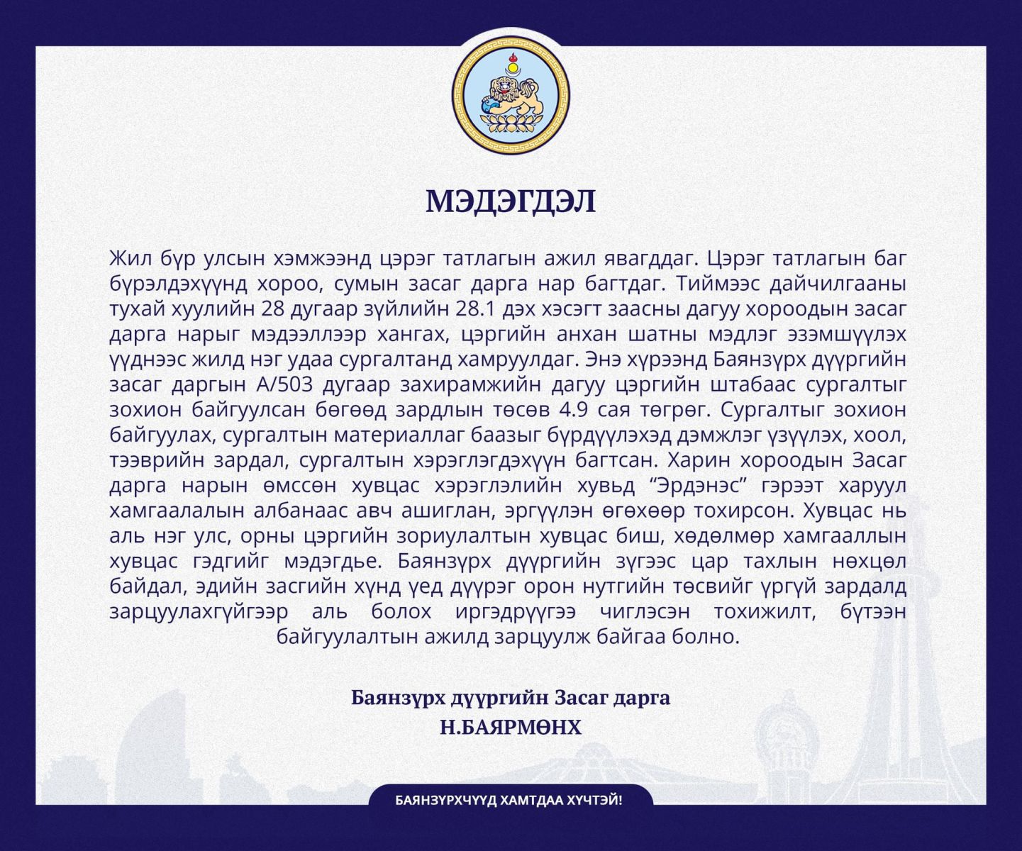 Жил бүр улсын хэмжээнд цэрэг татлагын ажил явагддаг. Цэрэг татлагын баг бүрэлдэхүүнд хороо, сумын засаг дарга нар багтдаг. Тиймээс дайчилгааны тухай хуулийн 28 дугаар зүйлийн 28.1 дэх хэсэгт заасны дагуу хороодын засаг дарга нарыг мэдээллээр хангах, цэргийн анхан шатны мэдлэг эзэмшүүлэх үүднээс жилд нэг удаа сургалтанд хамруулдаг. Энэ хүрээнд Баянзүрх дүүргийн засаг даргын А/503 дугаар захирамжийн дагуу цэргийн штабаас сургалтыг зохион байгуулсан бөгөөд зардлын төсөв 4.9 сая төгрөг.