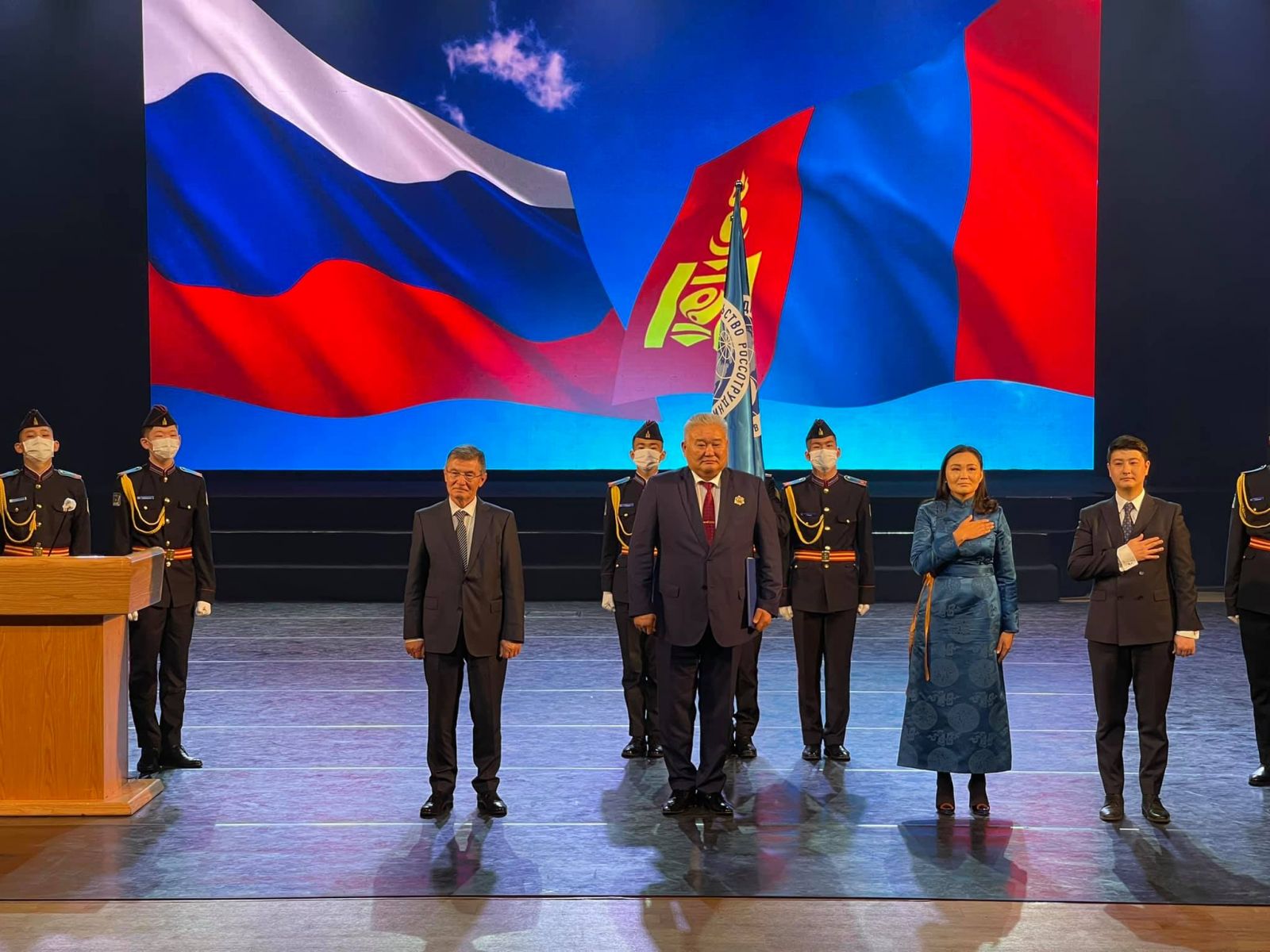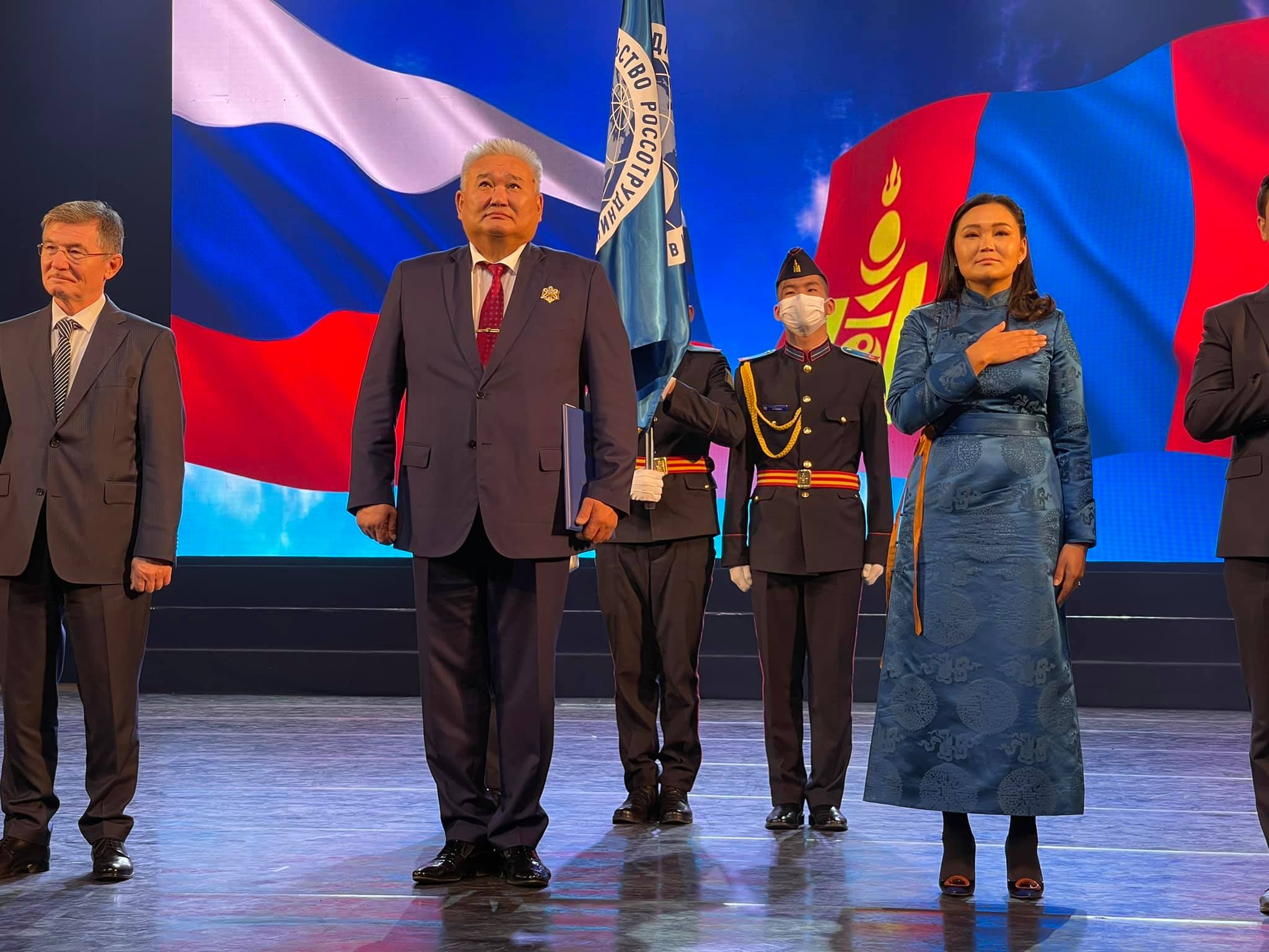 “Россотрудничество” агентлагийн далбаа Монгол Улсын Соёлын сайд Ч.Номингийн өмнө “мэхийж" Алтан гадас одонг оройдоо залсан юм.