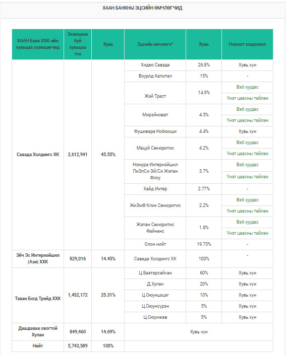 Одоогоор Хаан банкны 60 хувийн Япон улсын иргэн Савада Хидео гэгч эзэмшиж байгаа. Тэрбээр Хаан банкны ТУЗ-ийн даргаар ажиллаж буй. Японы “Савада Холдингс” компани Хаан банкны 45.55 хувийг, түүний охин компани Хонконгт бүртгэлтэй “Эйч Эс Интернэшнл” 14.45 хувийг эзэмшдэг. Хаан банкны уг хувьцааг авах арилжаанд Ерөнхийлөгч асан Х.Баттулгыг, мөн Худалдаа хөгжлийн банкны Д.Эрдэнэбилэг нарыг худалдан авсан яриа ч гарсан.