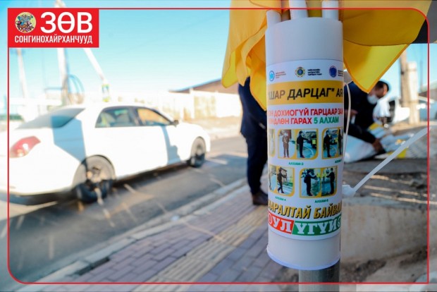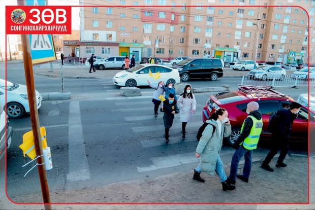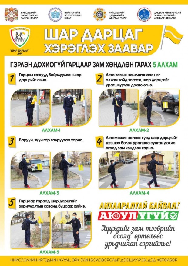 Аяны хүрээнд Сонгинохайрхан дүүргийн ЗДТГ, Боловсролын хэлтэс, Хууль эрх зүйн хэлтэс, Цагдаагийн газар, Замын цагдаагийн хэлтсийн албан хаагчид хамтран Ерөнхий боловсролын сургууль, цэцэрлэгийн орчинд дахь явган хүний гарцын хажууд шар дарцгийг байрлууллаа. Энэхүү аян нэг сарын хугацаанд үргэлжлэх юм.