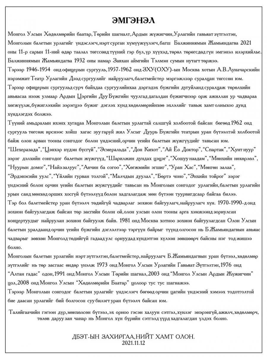 Хөдөлмөрийн баатар, Төрийн шагналт, Ардын жүжигчин, Хөгжмийн театрыг үндэслэгчдийн нэг, Ерөнхий балетмейстер Балжиннямын Жамьяндагва 2021 оны арваннэгдүгээр сарын 11-ний өдөр таалал төгсжээ. Түүний гэр бүл, үр хүүхэд, төрөл төрөгсдөд гүн эмгэнэл илэрхийлье.