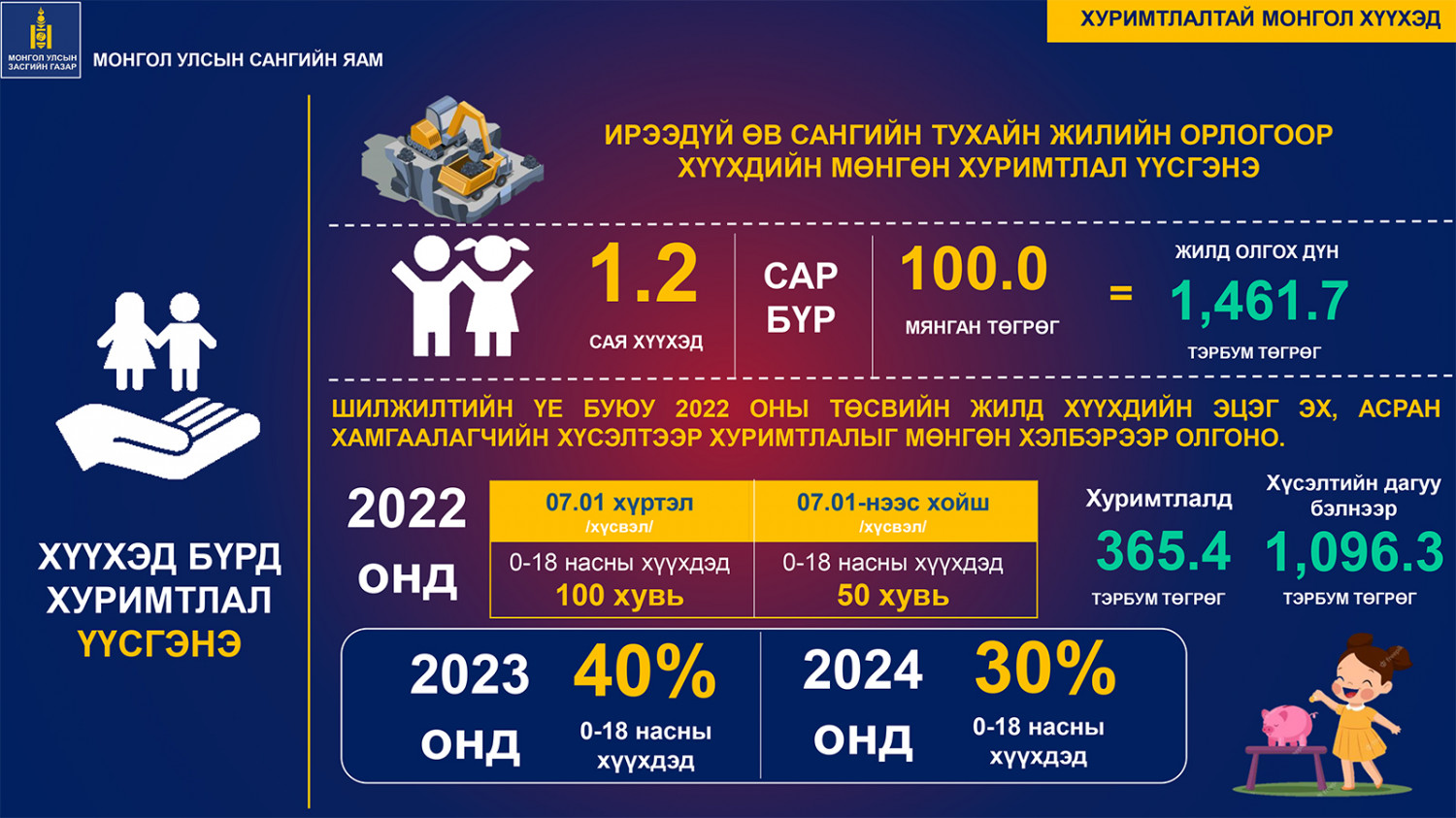 Тэгвэл бодлого тодорхойлогчид цар тахлын эдийн засаг дахь дарамт ирэх оны дунд гэхэд арилна гэж үзэн, долоодугаар сараас хүүхдийн мөнгийг 50 хувиар танаж, 0-18 насны хүүхэд бүрд сар тутамд олгодог бэлэн тэтгэмжийг 50 мянган төгрөг байхаар тусгасан юм. Учир нь улс цаашид хүүхдийн мөнгөний зардлыг гаргаж дийлэхээ больсон бөгөөд ирэх онд хүүхдийн мөнгөн тэтгэмжийг Ирээдүйн өв сангаас санхүүжүүлэхээс өөр гарцгүй болсон.