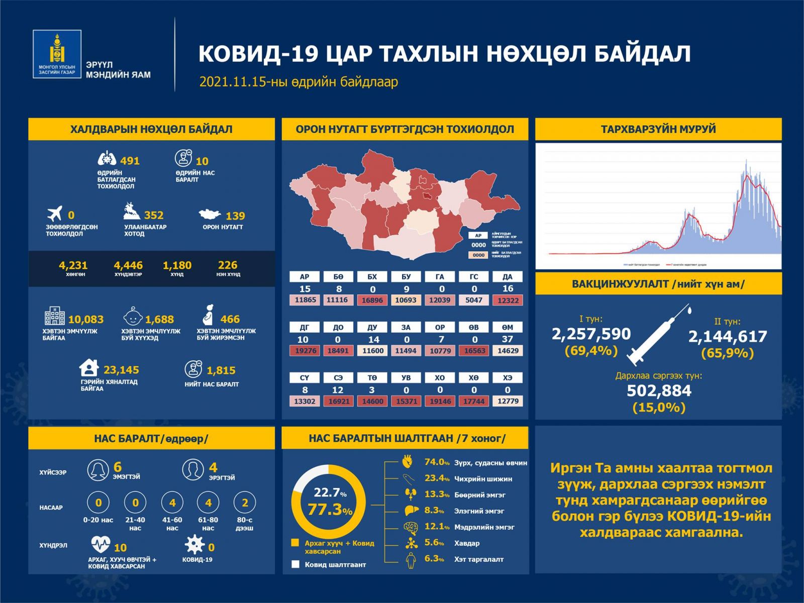Улсын хэмжээнд сүүлийн 24 цагийн хугацаанд ковид-19 халдварын 491 тохиолдол батлагджээ. Үүнээс Улаанбаатар хотод 352, орон нутагт 139 нь илэрсэн байна. Харамсалтай нь, мөн хугацаанд архаг хууч өвчтэй, ковид хавсарсан 10 хүн нас барсан баржээ. Ингэснээр ковидын халдвараар нас барсан хүний тоо 1815 боллоо.