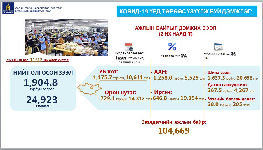 Энэ сарын 12-ны өдрийн байдлаар ажлын байрыг дэмжих гурван хувийн хүүтэй зээлд 24.923 зээлдэгч хамрагджээ. Нийт 1,904.8 тэрбум төгрөгийн зээлийг олгосон байна. Уг зээлийн үр дүнд 104.669 ажлын байр хадгалагдсан гэж ЖДҮ-ийн газрын дарга Я.Эрдэнэсайхан илтгэлдээ дурдлаа.