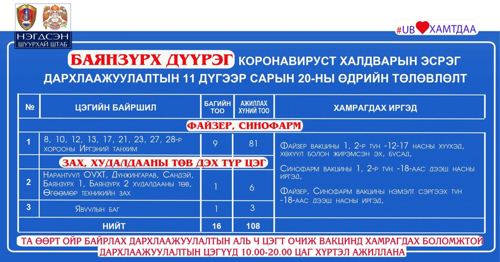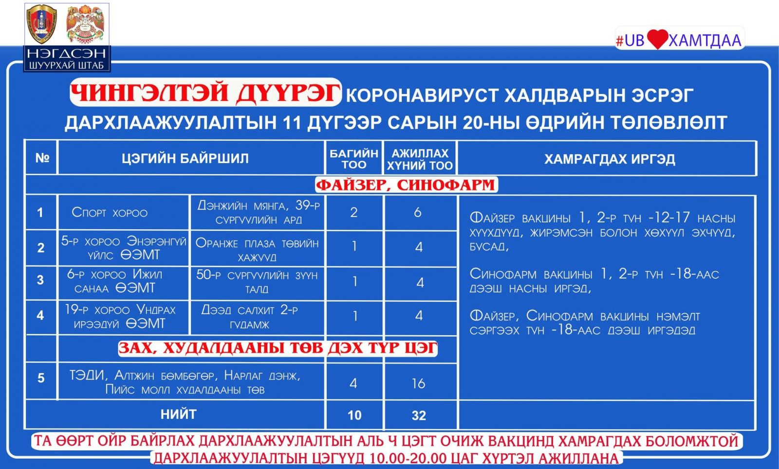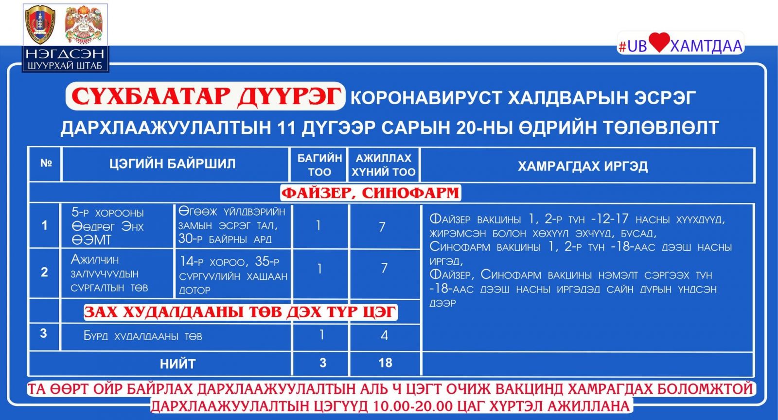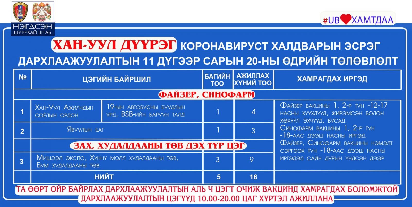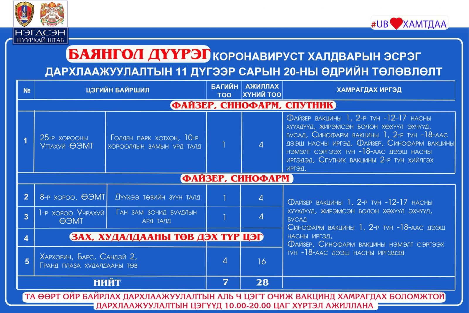 Өнөөдөр /2021.11.20/ Улаанбаатар хотод явуулын 3, суурин 23, түр 23 цэгт 51 багийн 249 эмч, ажилтан ажиллаж, 4492 иргэнийг дархлаажуулахаар төлөвлөжээ. Томоохон зах, худалдааны төвүүдэд 23 түр цэг ажиллаж байна. Иргэд өөрт ойр вакцины аль ч цэгт очиж дархлаажуулалтад хамрагдах боломжтой. Дархлаажуулалтын цэгүүд 10:00-20:00 цаг хүртэл ажиллах аж.