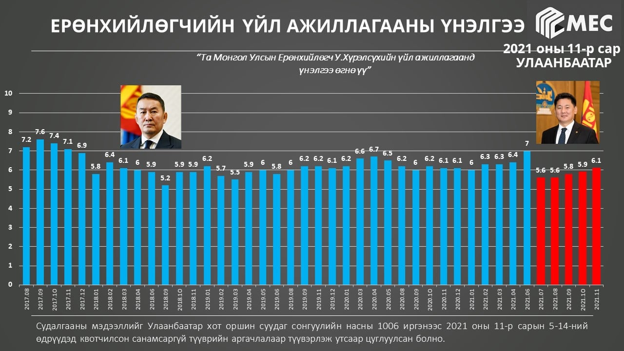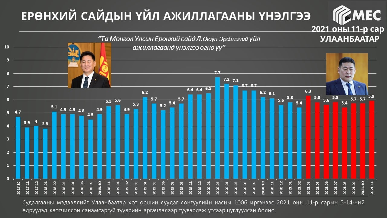 Сар бүр MEC судалгааны байгууллагаас улстөрчдийн чансааг тодорхойлж, түүнийгээ олон нийтэд ил тод зарладаг. Энэ жишгээр тэд АРВАННЭГДҮГЭЭР САРЫН судалгааны дүнгээ танилцуулав. Судалгааг санамсаргүй түүврийн аргаар 1006 хүнтэй утсаар холбогдож, авчээ.
