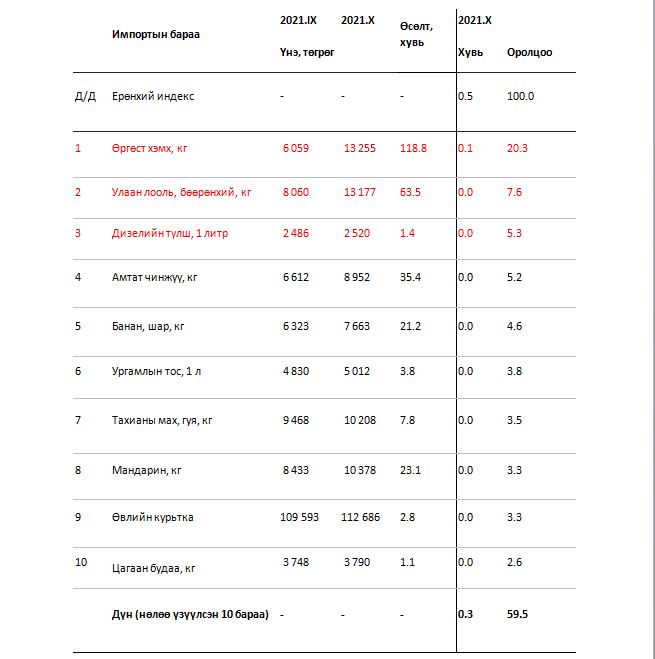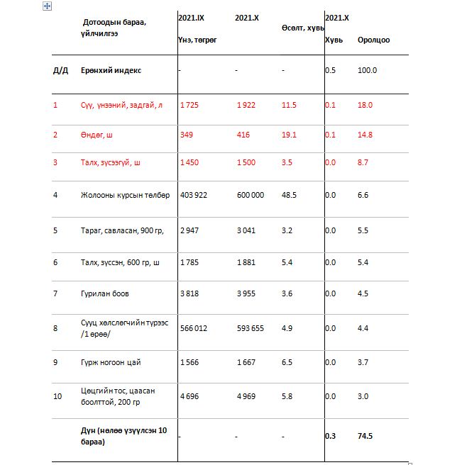 Тэгвэл тавдугаар сард 6.2 хувьд хүрсэн инфляц аравдугаар сард улсын хэмжээнд өмнөх оны мөн үеэс болон өмнөх оны эцсээс тус тус 9.7 хувь, өмнөх сараас 0.5 хувиар өссөн гэсэн мэдээллийг Үндэсний статистикийн хорооноос танилцууллаа.
