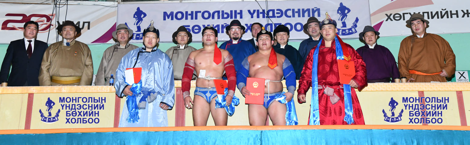 УИХ-ын дарга Г.Занданшатар, УИХ-ын гишүүн, дархан аварга Б.Бат-Эрдэнэ, УИХ-ын гишүүн, ХЗДХ-ийн сайд Х.Нямбаатар, УИХ-ын гишүүн Д.Тогтохсүрэн, МҮБХ-ны тэргүүн, улсын заан Ц.Магалжав, дэд тэргүүн, улсын аварга О.Балжинням нар их шөвгийн бөхчүүдэд шагнал гардуулж, баяр хүргэлээ.