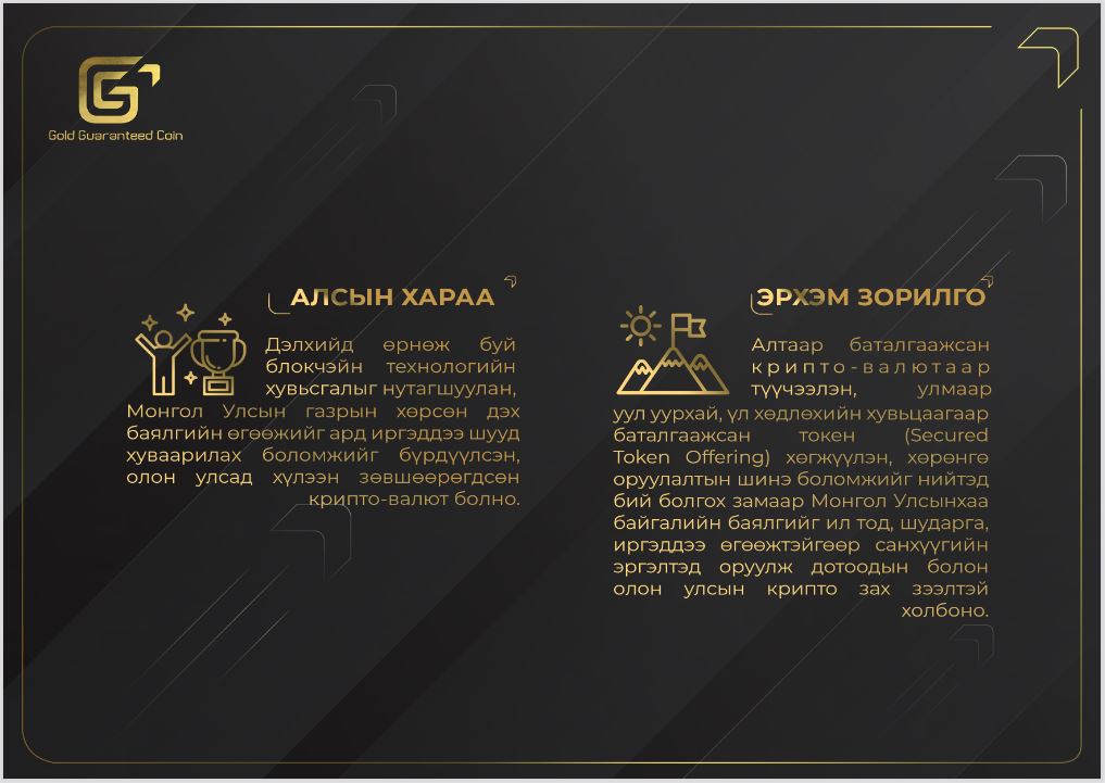 Монголын алт, мөнгө, зэс баялагаар баталгаажсан крипто-валютыг эзэмшиж хамгийн бага эрсдэлээр өндөр ашиг олох хөрөнгө оруулалтын шинэ салбарт нэгдэн, эх орныхоо баялагийн жинхэнэ эзэн болцгооё.
