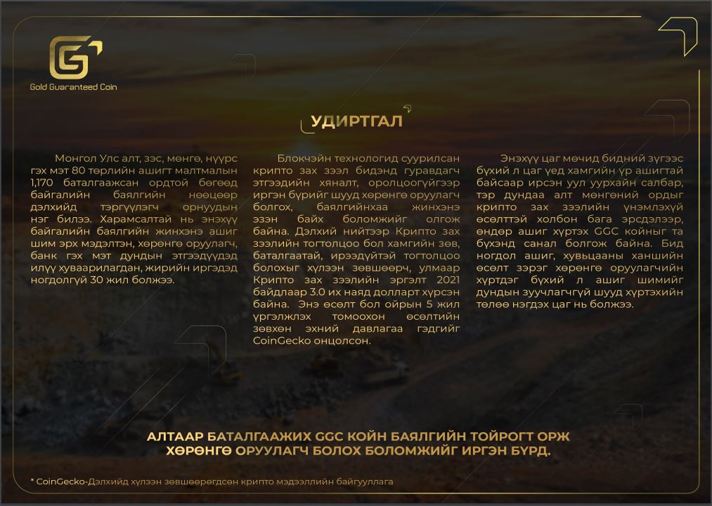 Gold Guaranteed Coin /GGC/ төслийн WHITEPAPER нь Монголд анхдагч гадны хөрөнгө оруулалт, банкны нөлөөгүйгээр крипто зах зээлийн төгс өрсөлдөөний боломжид тулгуурлан иргэдийн шууд оролцоот хөрөнгө оруулалтын төсөл юм.