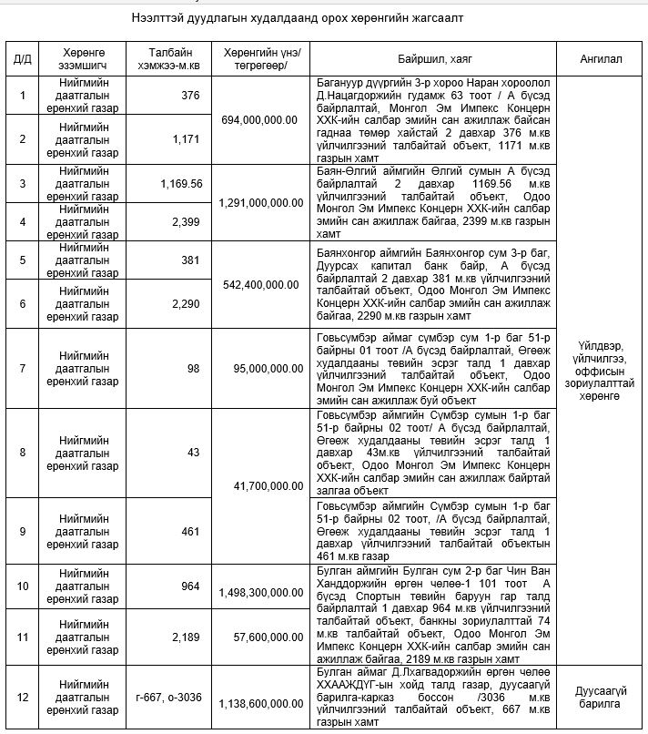 НДЕГ-аас хөрөнгийг худалдах нээлттэй дуудлагын худалдааны зар