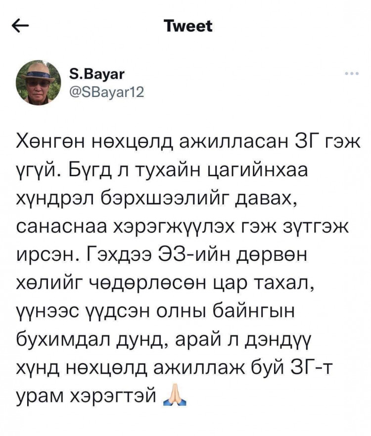 Монгол Улсын Ерөнхий сайд асан С.Баяр өөрийн цахим хуудаснаа хүнд нөхцөлд ажиллаж байгаа Засгийн газарт урам өгөх хэрэгтэй хэмээн жиргэжээ.