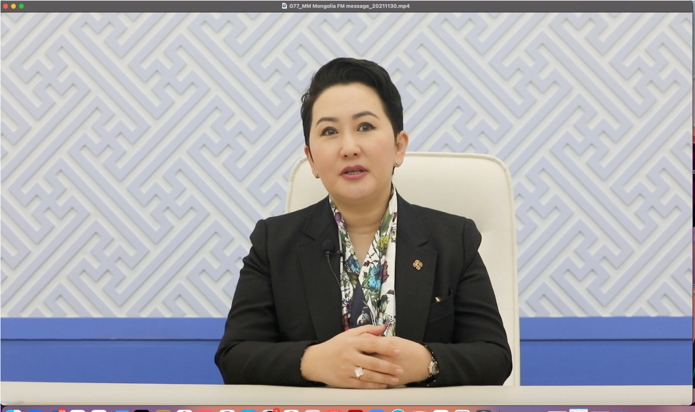 Гадаад харилцааны сайд Б.Батцэцэг энэхүү уулзалтад цахим хэлбэрээр оролцож, байр сууриа илэрхийллээ. Тэрбээр хэлсэн үгэндээ цар тахлын хор нөлөө хөгжиж буй орнуудын нийгэм, эдийн засагт хүндээр тусаж буй энэ цаг үед 77-гийн бүлгийн сайд нар цахимаар чуулж, ковидоос үүдэлтэй бэрхшээл сорилтуудыг даван туулах, тогтвортой хөгжлийн зорилтуудын хэрэгжилтийг эрчимжүүлэх хүрээнд хэрэгжүүлж буй арга, туршлагаасаа хуваалцан, бодлого, шийдлийг хэлэлцэж байгаа нь чухал ач холбогдолтойг цохон тэмдэглэв.