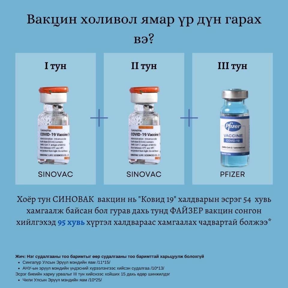 СИНОВАК вакцинын хоёр тун хийлгэсэн хүн гурав дахь тунд ФАЙЗЕР хийлгэснээр халдвараас 95 хувь хамгаалж байгааг ХӨСҮТ-өөс мэдээллээ.