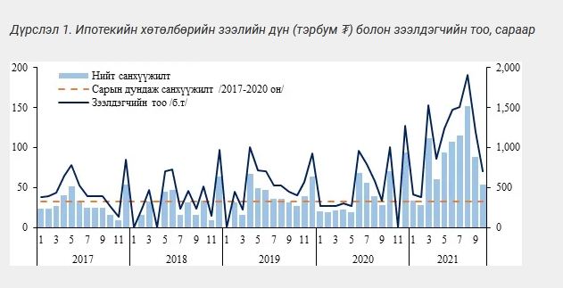 Тодотгоход, өнгөрсөн дөрвөн жилд ипотекийн хөтөлбөрийн хүрээнд сард дунджаар 32.6 тэрбум төгрөгийн зээлийг олгож байсан бол энэ онд сард дунджаар 84.4 тэрбум төгрөгийн зээлийг олгожээ.