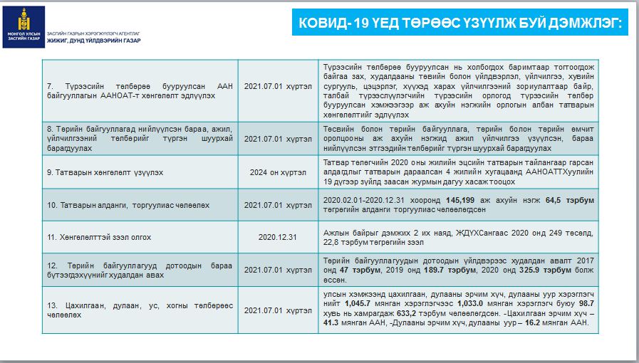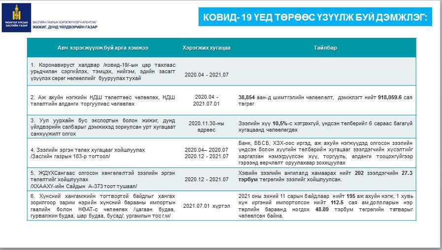 Түүнчлэн Жижиг, дунд үйлдвэрийн газрын дарга Я.Эрдэнэсайхан цар тахлын үед ЖДҮ салбарын бодит байдал ямар байгааг, даван туулах ямар гарцууд байгаа талаар байр сууриа илэрхийлж, илтгэл тавьсан. Түүний илтгэлээс онцлох мэдээллүүдийг дараах графикуудаар хүргэж байна.