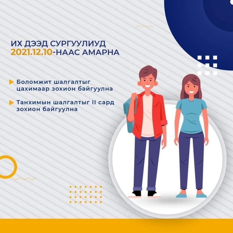 Арванхоёрдугаар сарын 13-ны өдрөөс амралт эхэлнэ. Хоёрдугаар сарын 15-ны дотор багтааж шалгалтыг танхим болон цахим гэсэн хувилбараар зохион байгуулна.