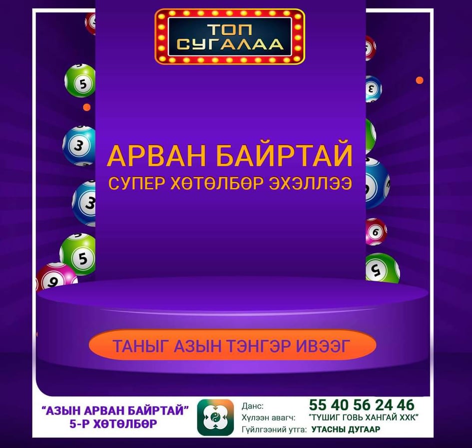 "Түшиг Говь Хангай" ХХК-аас зохион байгуулж байгаа ТОП СУГАЛАА “Азын арван байртай” 5-р хөтөлбөрийн үндсэн тохирлууд тухайн сарын 9, 19, 29-ний өдрүүдэд болох ба нэмэлт урамшуулал тохирол сарын бүрийн 1, 15-нд явагдаж, супер шагналуудыг гардуулаад эхэлсэн байна. Арванхоёрдугаар сарын эхний нэмэлт урамшуулал тохирол 1-ний өдөр болж, Турк улсын Анталия хот уруу аяллын эрх болон Iphone 12 pro max-ын азтанууд шалгарчээ.