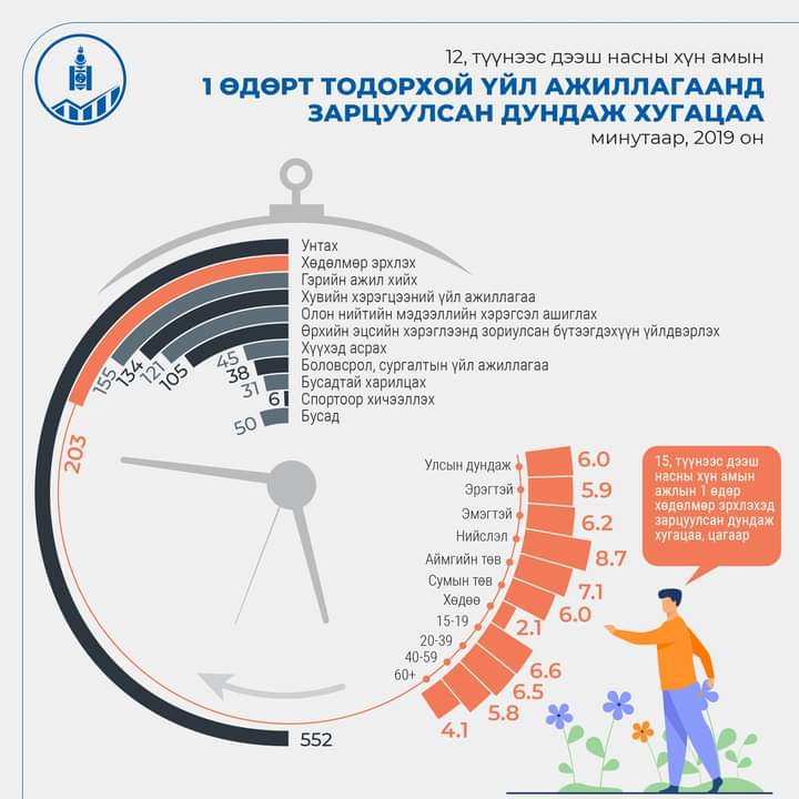 Үүнээс гадна 15, түүнээс дээш насны хүн амын цаг ашиглалтын байдлыг хөдөлмөр эрхлэлтийн байдлаар авч үзвэл, хөлстэй хөдөлмөр эрхлэхэд өдөрт дунджаар 6 цагийг зарцуулжээ.