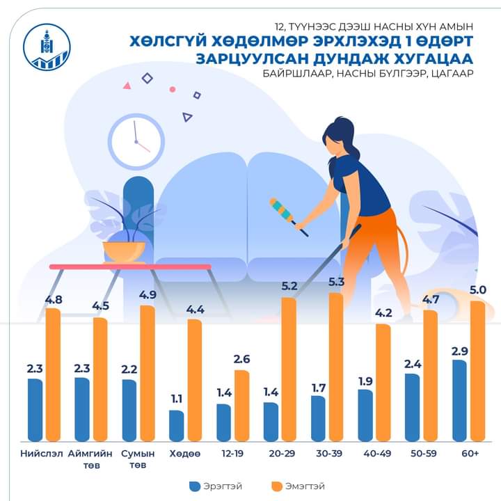 Тухайлбал охид, эмэгтэйчүүд хөлсгүй хөдөлмөр эрхлэхэд зарцуулж буй дундаж хугацаа нь 4.7 цаг байсан бол эрэгтэйчүүдийнх 2 цаг байна.