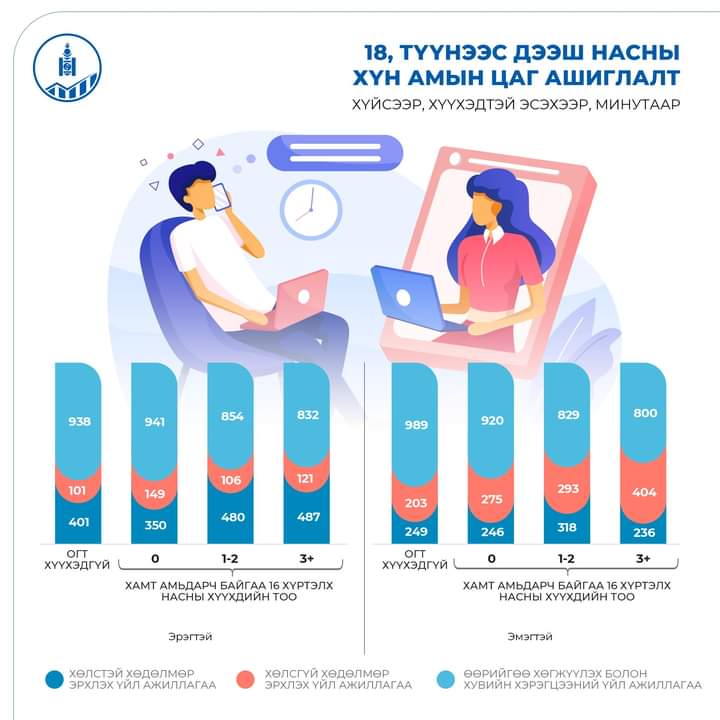 Тус үзүүлэлтийг хүйсээр нь харвал эрэгтэйчүүдийн хувьд 5.9 цаг, харин эмэгтэйчүүд 6.2 цаг байна гэж Үндэсний Статистикийн Хорооноос мэдээллээ.