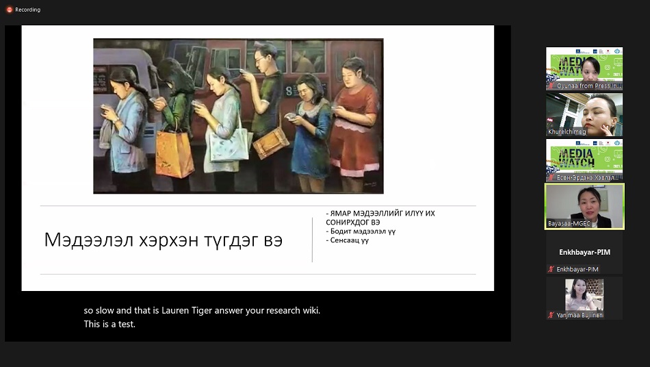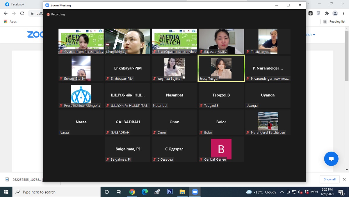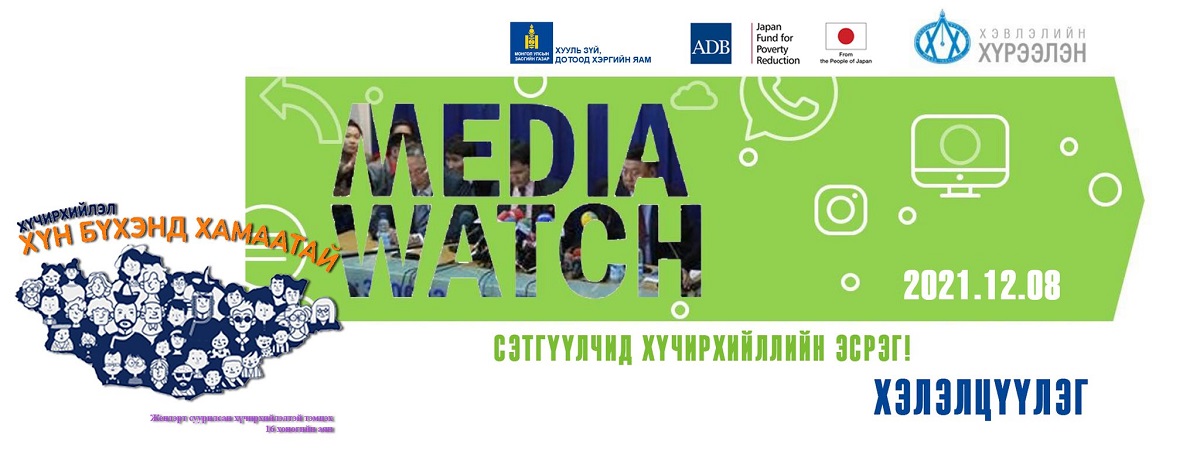 Жендэрт суурилсан хүчирхийллийн эсрэг 16 хоногийн аян өрнөж, “Сэтгүүлчид хүчирхийллийн эсрэг!” уриан дор цуврал арга хэмжээ зохион байгуулж буй билээ. Энэ хүрээнд “MEDIA WATCH” хэлэлцүүлгийг 12 дугаар сарын 8-ны 17.00 цагт цахим хэлбэрээр зохион байгууллаа.