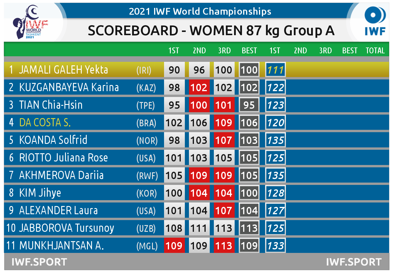 Энэ хэсэгт 11 тамирчин байгаа бөгөөд Анхаа огцом өргөлтийн гурван оролдлогын дараа 109 кг-ын амжилтаар 2-т орлоо. 113 кг-ыг сүүлд захиалсан ч өргөж чадсангүй. Энэ төрөлд нутгийн эзэн Узбекистаны Tursunoy Jabborova 113 кг өргөж тэргүүллээ.