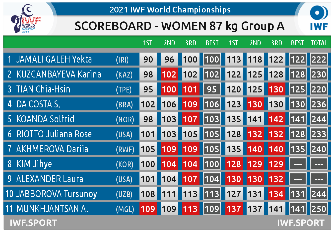 Эхлээд узбек тамирчин гарч, 131 кг өргөсөн ч 134 дээр алдаж, нийлбэр дүн 244 дээр зогслоо. Дараа нь Норвегийн Solfrid Koanda 135 кг өргөлөө. Оросын Дарья мөн 135 кг-ыг хөнгөхөн өргөв. Тэр дараа нь шууд 140 захиалжээ. Харин норвег тамирчин 141-ийг.