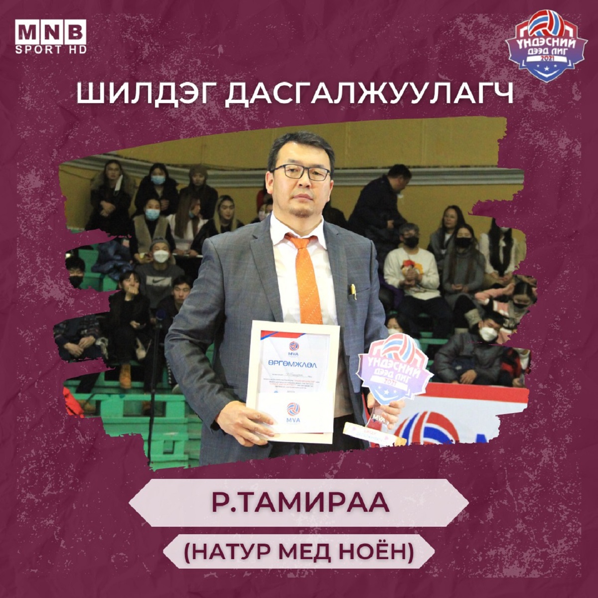 Монголын волейболын холбооны "Үндэсний дээд лиг-2021" тэмцээн хоёр сарын турш үргэлжилж өнгөрөгч баасан гарагт шилдгүүд тодорсон билээ. Энэ удаагийн лигийн тэмцээний эрэгтэйчүүдийн төрөлд "Натур Мед Ноён" баг алтан медаль хүртсэн. Тус багаас хүчний довтлогч Эрдэнэбаярын Энх-Амгалан шилдэг довтлогчоор, лигийн тэмцээний хамгийн үнэ цэнтэй тоглогчоор Тамираагийн Хангал нар шалгарсан билээ. Тэгвэл лигийн тэмцээний шилдэг дасгалжуулагчаар тус клубын дасгалжуулагч Р.Тамираа тодорсон юм. Түүнтэй "Үндэсний Дээд лиг-2021" тэмцээний эргэн тойронд ярилцсанаа хүргэж байна.