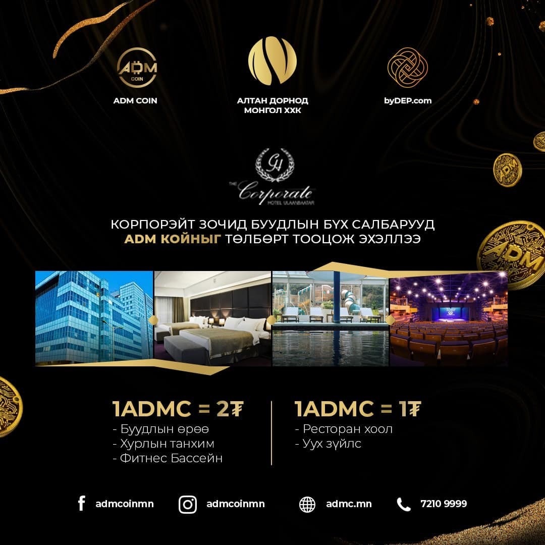 Крипто валютын зах зээлд жишиг болж буй “Алтан Дорнод Монгол” ХХК-ийн гаргаж буй ADM койны төслийн багийн зүгээс шинэ жилийн босгон дээр гайхалтай, өгөөжтэй хадгалалтыг /HODL/ зарласнаас гадна "The Corporate Hotel and Convention Centre" ЗОЧИД БУУДЛЫН БҮХ САЛБАРУУД ADMCoin-г төлбөрт тооцох дараах боломжуудыг олгож эхэлснийг дуулгая.