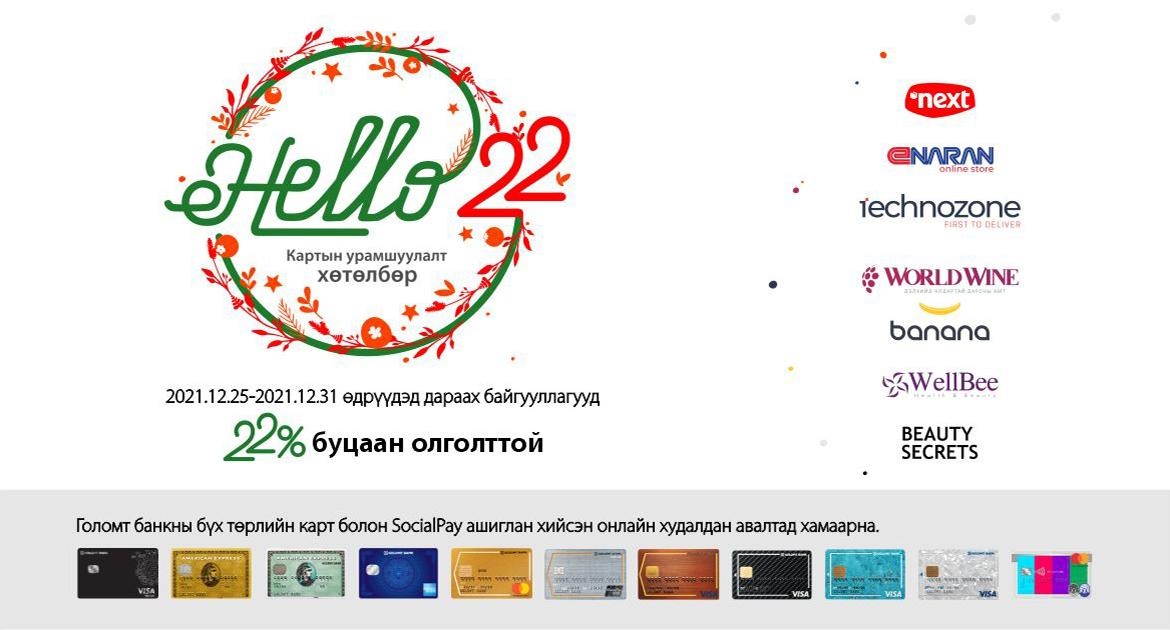 Голомт банк шинэ оныг угтан “Hello22” онлайн худалдан авалтын урамшууллыг зарлаж байна. Энэхүү урамшуулал нь 2021.12.25-2021.12.31-ний хооронд ердөө 7 хоног л үргэлжлэх юм. Hello22 урамшуулал үргэлжлэх хугацаанд та Голомт банкны бүх төрлийн карт болон SocialPay аппликэйшн ашиглан дараах 7 вэбсайтаас худалдан авалт хийгээд 22%-ийн буцаан олголт авах боломжтой.