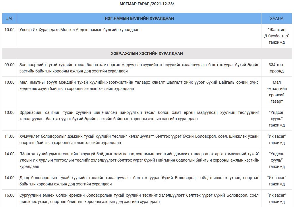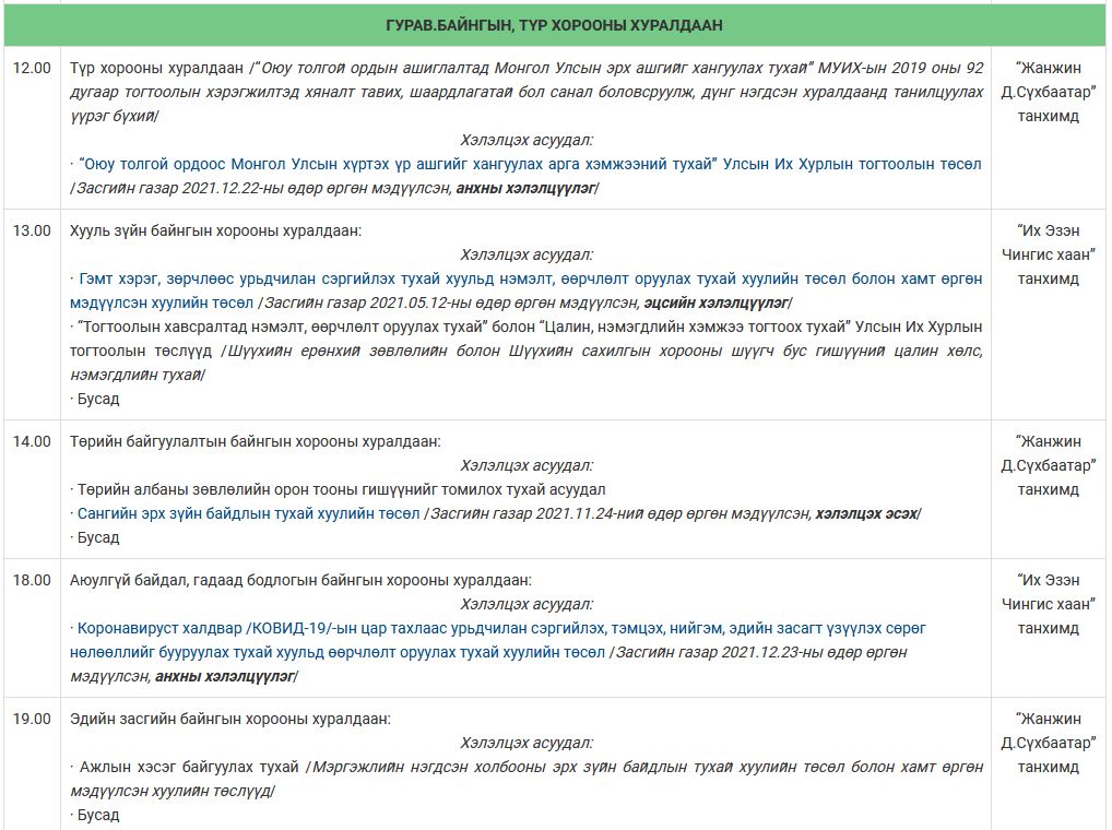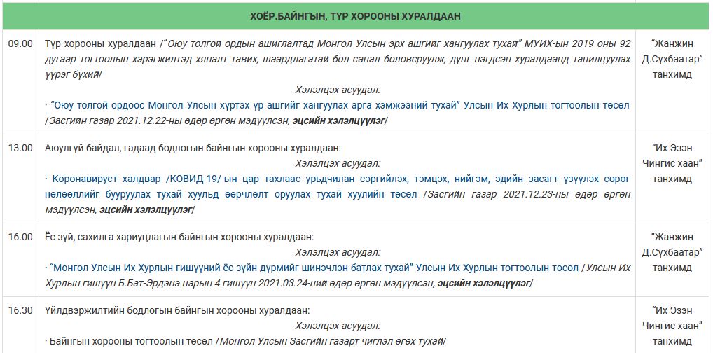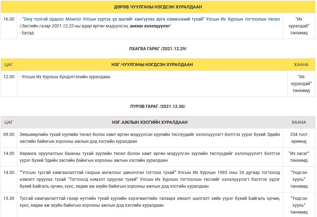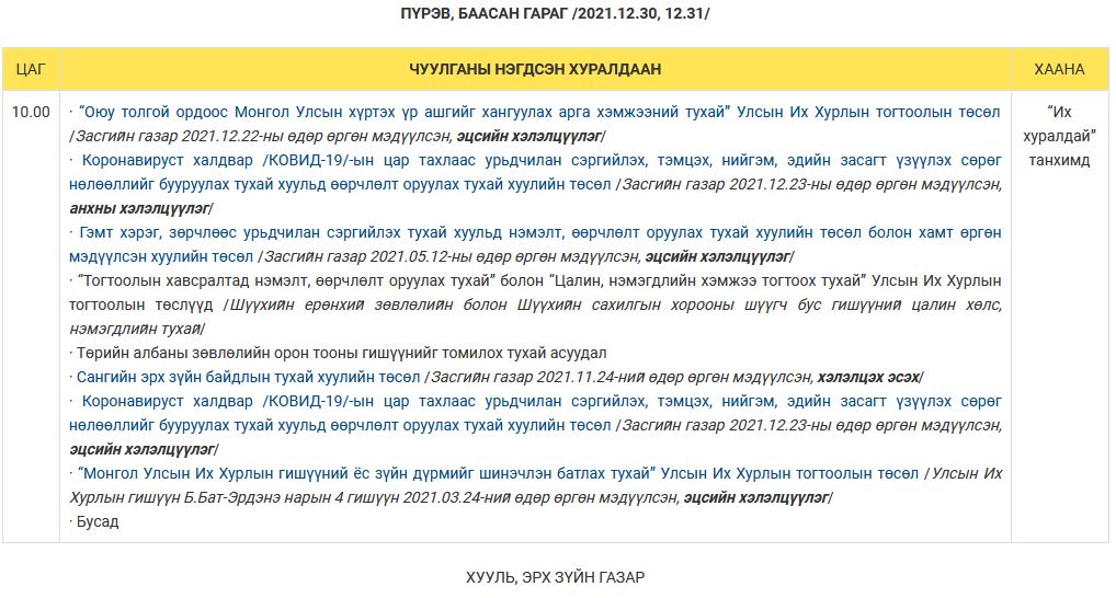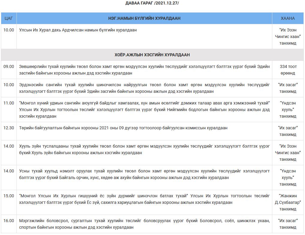 Улсын Их Хурлын намрын ээлжит чуулганы 2021 оны арванхоёрдугаар сарын 27-ноос 31-ний өдрүүдийн намын бүлэг, ажлын хэсэг, байнгын, түр хорооны болон чуулганы нэгдсэн хуралдаанаар хэлэлцэх асуудлын тов, дараалал