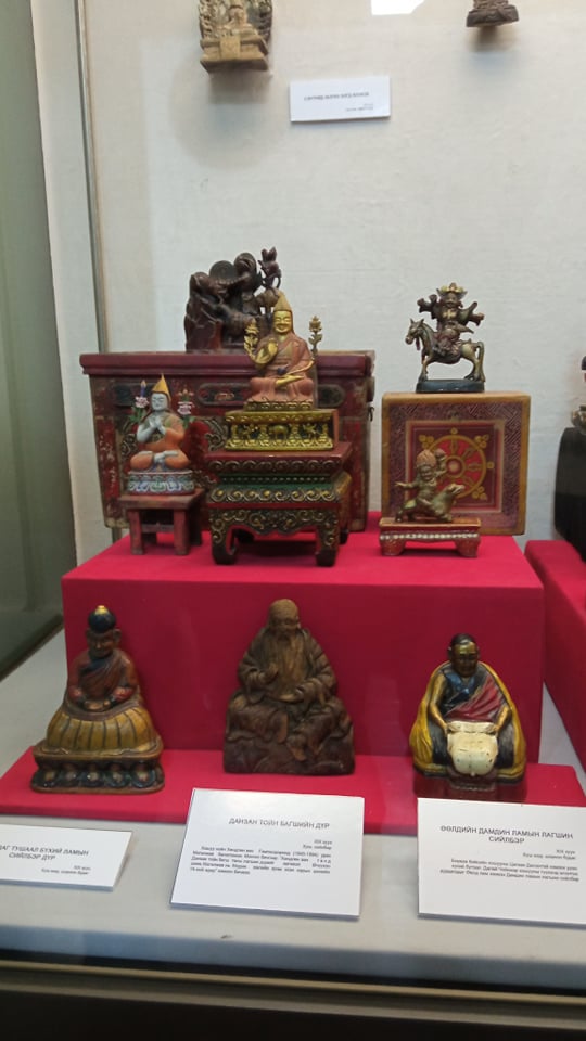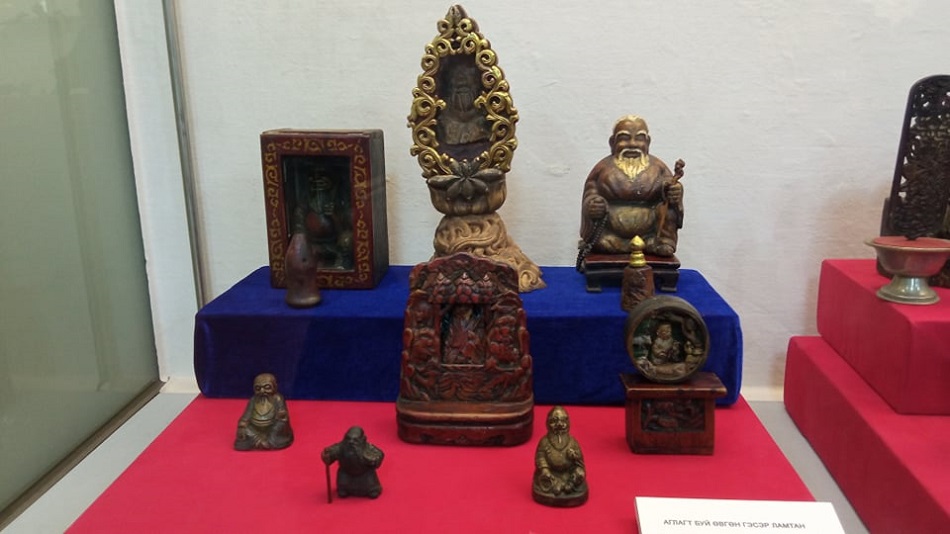 Мөн үзэсгэлэнгийн гол танхимын хойморт Богд зонхов, Бурхан багш, ловон Бадамжунай нарын модоор урласан сэрэг дүрийг байрлуулж, тус бүрийн өмнө зул бадамлуулсан байсан юм. Энэ дунд нэлээд олон тооны модон бар үзэгч олны анхаарлыг татсан үзмэр байлаа. Тэдгээрийн дотор Маанийн үсгийн, балингийн, Энэтхэгийн 84 шидтэний судрын, муу заяанаас гэтэлгэгч тарнийн, насны гурван бурханы, Богд Зонховын барыг эгнүүлэн тавьсан байна. Эдгээрийг хуш болон хус модоор хийсэн бөгөөд зуу илүү жилийн настай эд зүйлс ажээ.