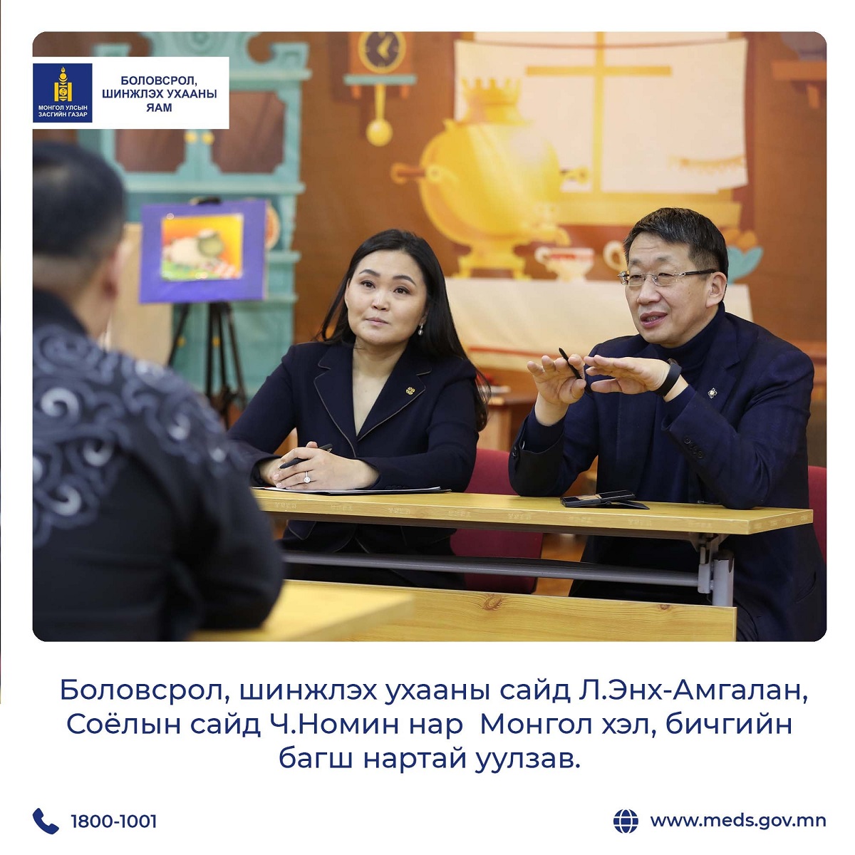 “Монголын сайхан бичигтэн” улсын уралдаанд оролцсон багш нарын төлөөлөлтэй БШУ-ны сайд Л.Энх-Амгалан, Соёлын сайд Ч.Номин нар уулзлаа. Эх хэлний хэрэглээг сайжруулах, хос бичигтэн болох зорилтын хүрээнд тулгамдаж байгаа асуудлуудыг багш нар ярьж байна.