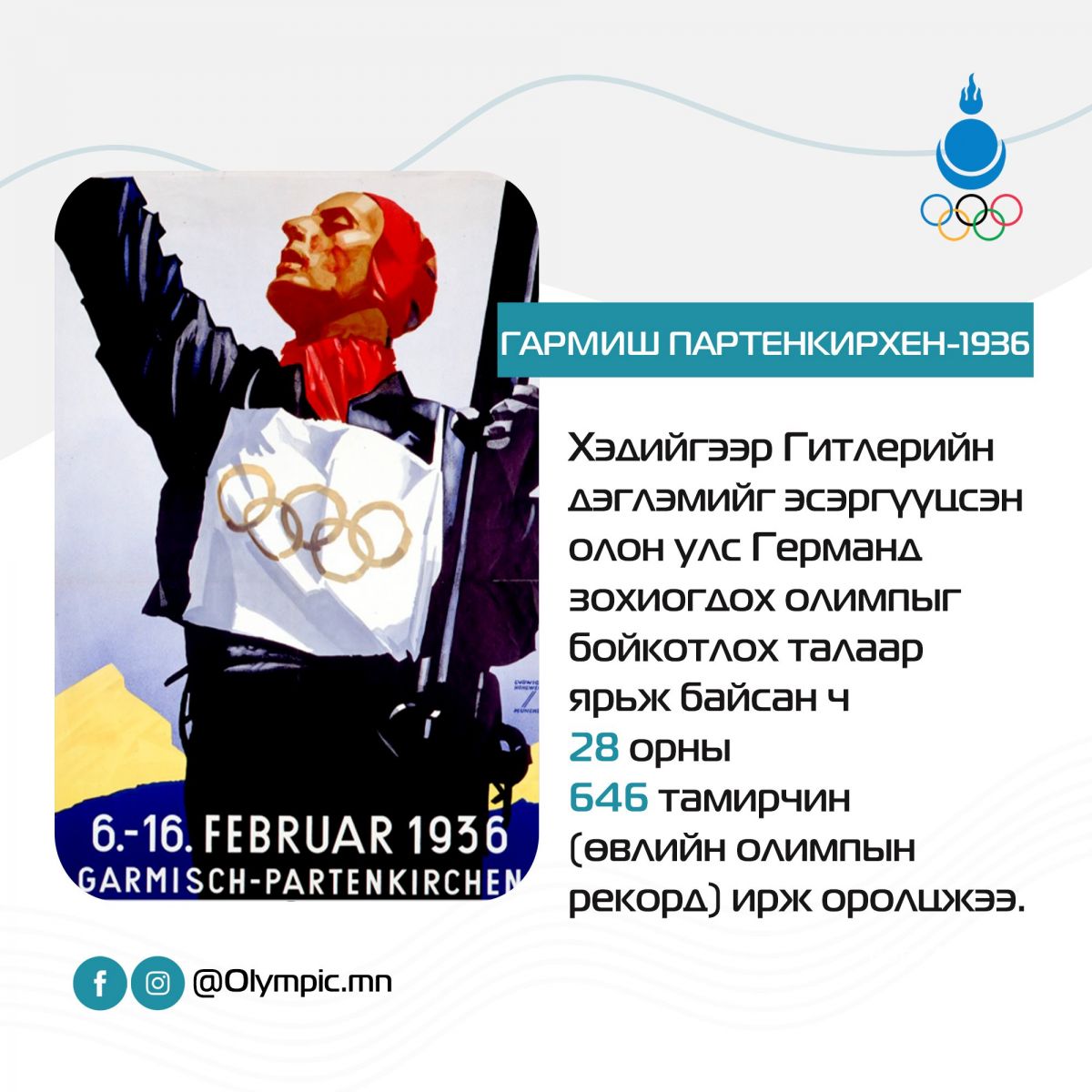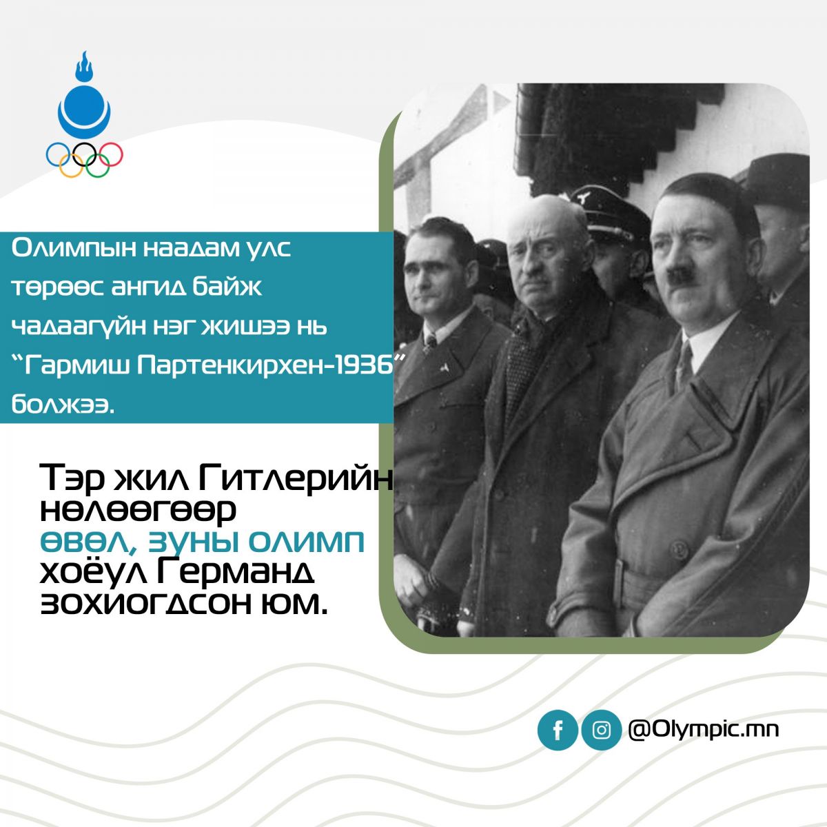 Олимпын наадам улс төрөөс ангид байж чадаагүйн нэг жишээ нь “Гармиш Партенкирхен-1936” болжээ. Тэр жил нацист дэглэмийн удирдагч Гитлерийн нөлөөгөөр өвөл, зуны олимп хоёул Германд зохиогдсон юм. Гитлер Германы засгийн эрхэнд гараад спортоор дамжуулан нацист дэглэмийн хүч чадлыг дэлхий нийтэд харуулахыг хүссэн. Түүний өмнөөс үгүй гэж хэлж чадах хүч тухайн үеийн ОУОХ-нд байсангүй. Ингээд өвлийн IV олимп Германы Бавари мужийн жижиг хот Гармиш Партенкирхенд болжээ.