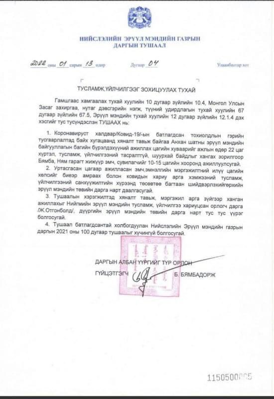 Нийслэлийн эрүүл мэндийн газрын даргын албан үүргийг түр орлон гүйцэтгэгч Б.Бямбадоржийн тушаал: