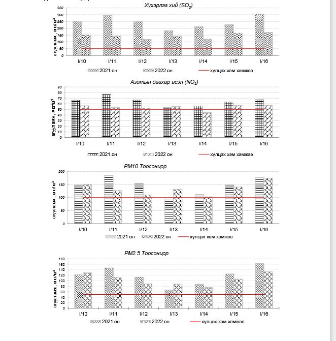Агаарын чанарыг тодорхойлох үүднээс Улаанбаатар хотын агаарт түгээмэл бохирдуулах бодис хүхэрлэг хий /SO2/, азотын давхар исэл /NO2/, тоосонцор /PM10, PM2.5/, нүүрстөрөгчийн дутуу исэл /CO/, озон /O3/-ы агууламжийг тодорхойлоход дараах үзүүлэлтүүд гарчээ.