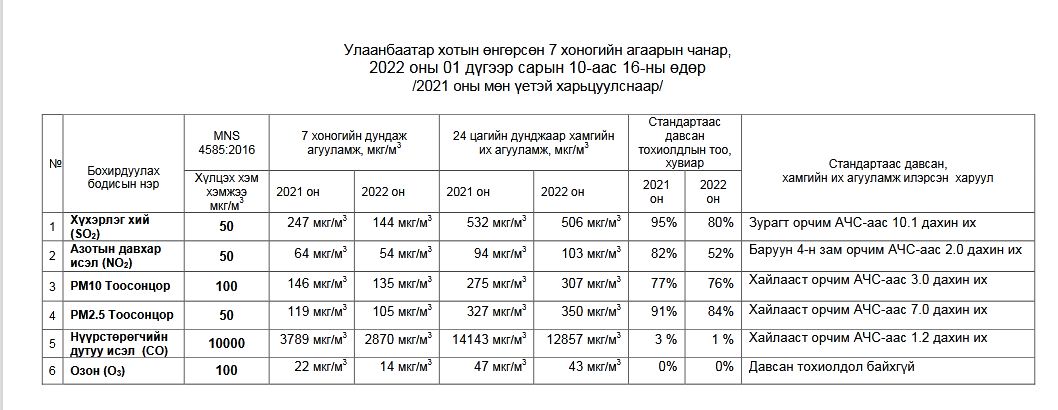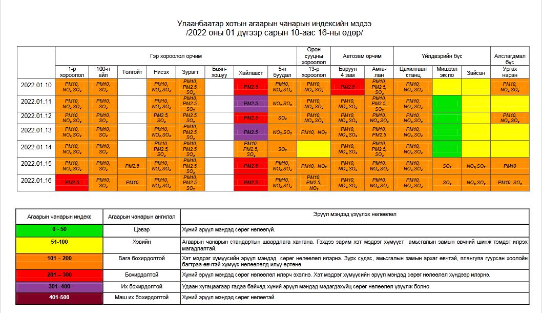 Улаанбаатар хотын агаарын чанар өнгөрсөн долоо хоногт буюу 1 дүгээр сарын 10-16-ны хооронд ямар байсныг хүргэе.