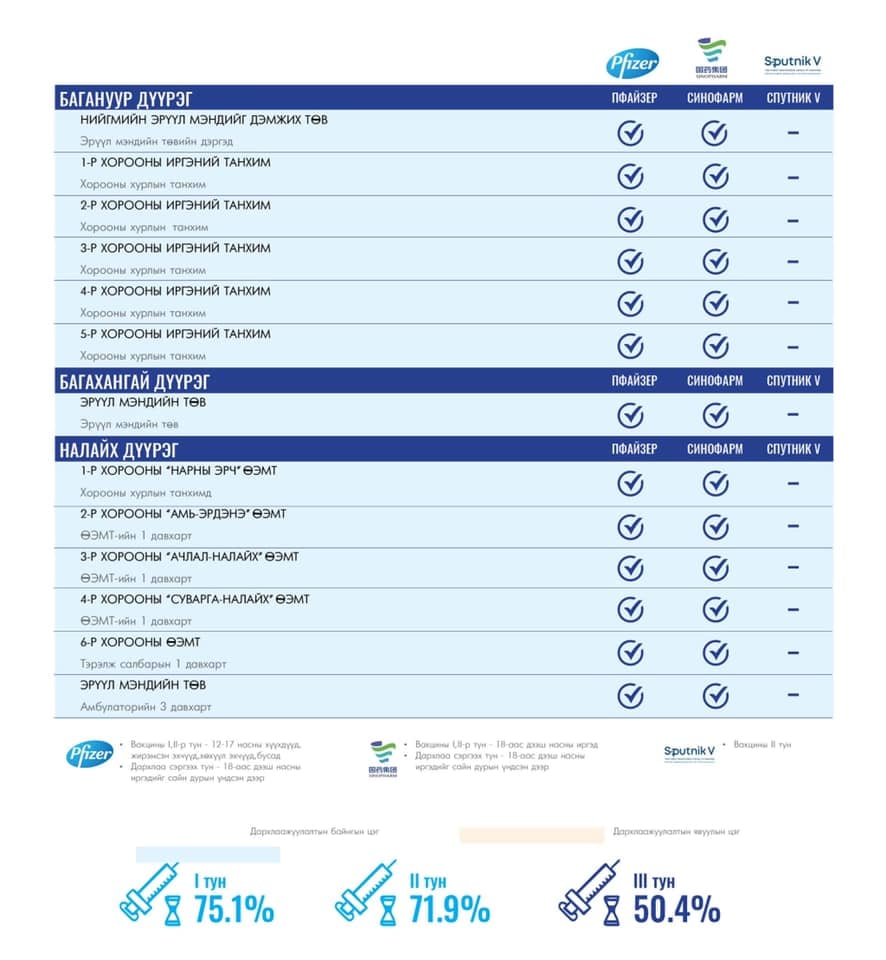 Дашрамд өгүүлэхэд, өчигдөр /2022.01.16-нд/ нийслэлийн хэмжээнд I тунд 22, II тунд 40, III тунд 782, IV тунд 1004, нийт 1848 иргэнийг дархлаажуулалтад хамрагдсан байна. Вакцинжуулалт эхэлснээс хойш нийслэлийн нийт хүн амын I тунгийн хамралт 75.1 хувь, II тунгийн хамралт 71.9 хувь, III тунгийн хамралт 50.5 хувь, нэмэлт IV тунгийн хамрагдалт 2.9 хувьтай байгаа юм. Зорилтот бүлгийн буюу 3024 (25.4 хувь) жирэмсэн эх, 12-15 насны 68.451 (77.0 хувь), 16-17 насны 26.991 (79.6 хувь) хүүхэд тус тус дархлаажуулалтын бүрэн тунд хамрагдлаа гэж Нийслэлийн Онцгой байдлын Ерөнхий газраас мэдээллэсэн байна.