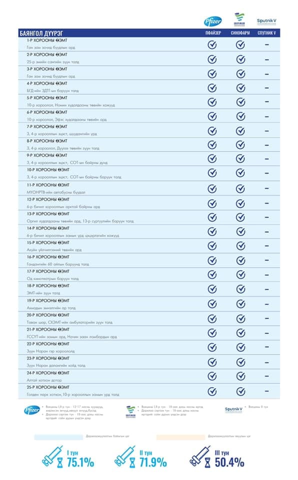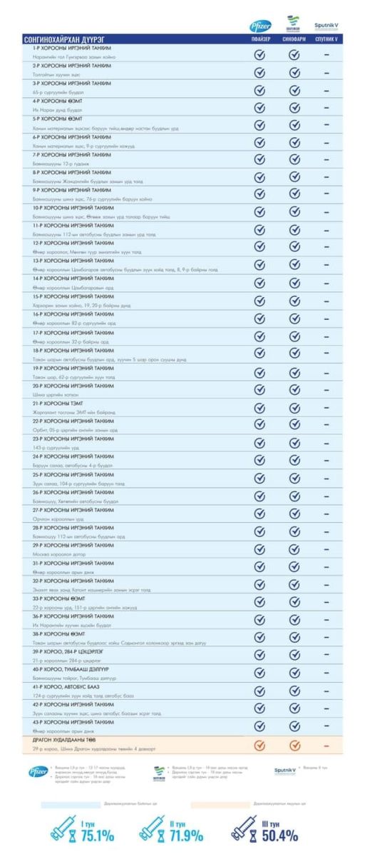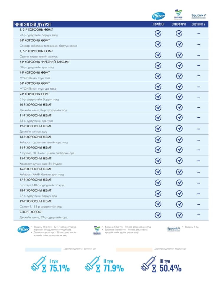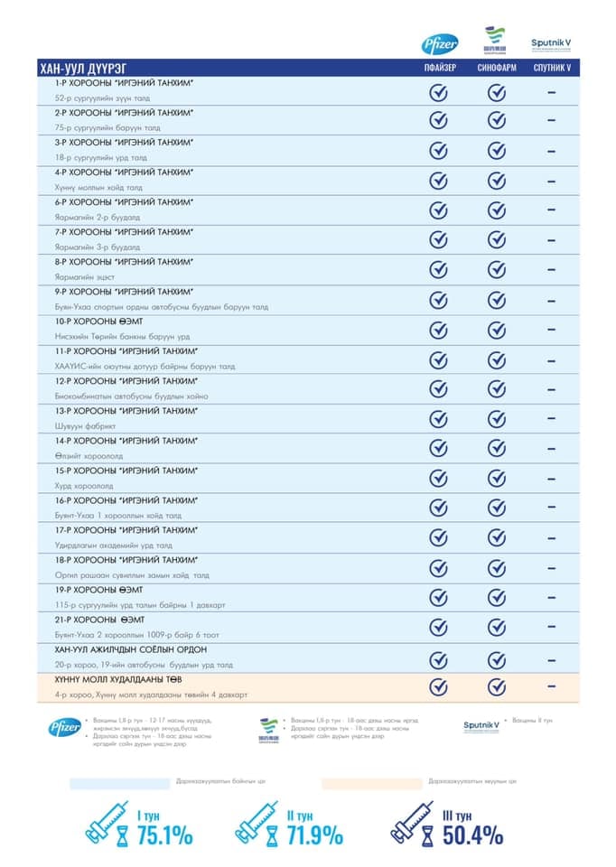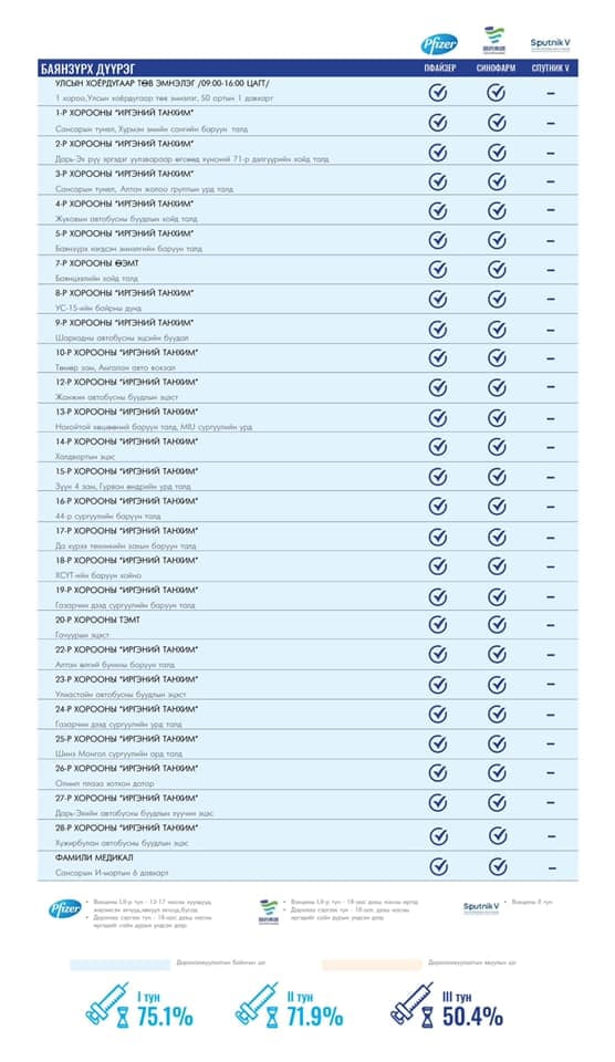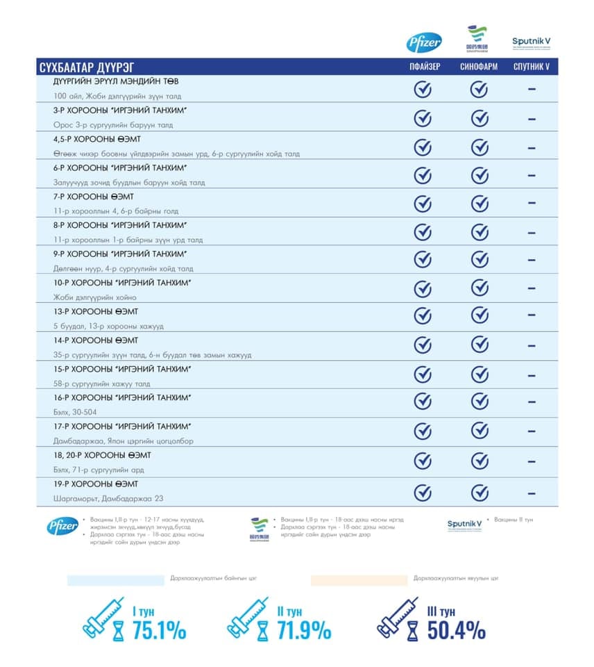 Улаанбаатар хотод /2022.01.17-ны байдлаар/ суурин 158, түр 2 цэгт 160 багийн 750 эмч, ажилтан ажиллаж, 8700 иргэнийг дархлаажуулахаар төлөвлөөд байна. Та өөрт ойр вакцины аль ч цэгт очиж дархлаажуулалтад хамрагдах боломжтой. Дархлаажуулалтын цэгүүд 09:00-18:00 цаг хүртэл ажиллах ажээ.