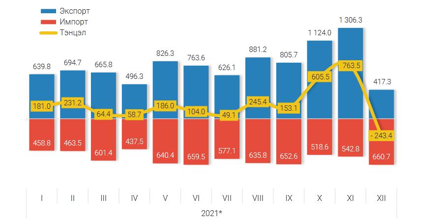Харин 2021 оны 12 дугаар сард экспорт 417.3 сая ам.доллар, импорт 660.7 сая ам.доллар болжээ. Экспорт өмнөх сараас экспорт 889 сая ам.доллароор буурсан бол импорт 117.9 сая ам.доллароор өсжээ.